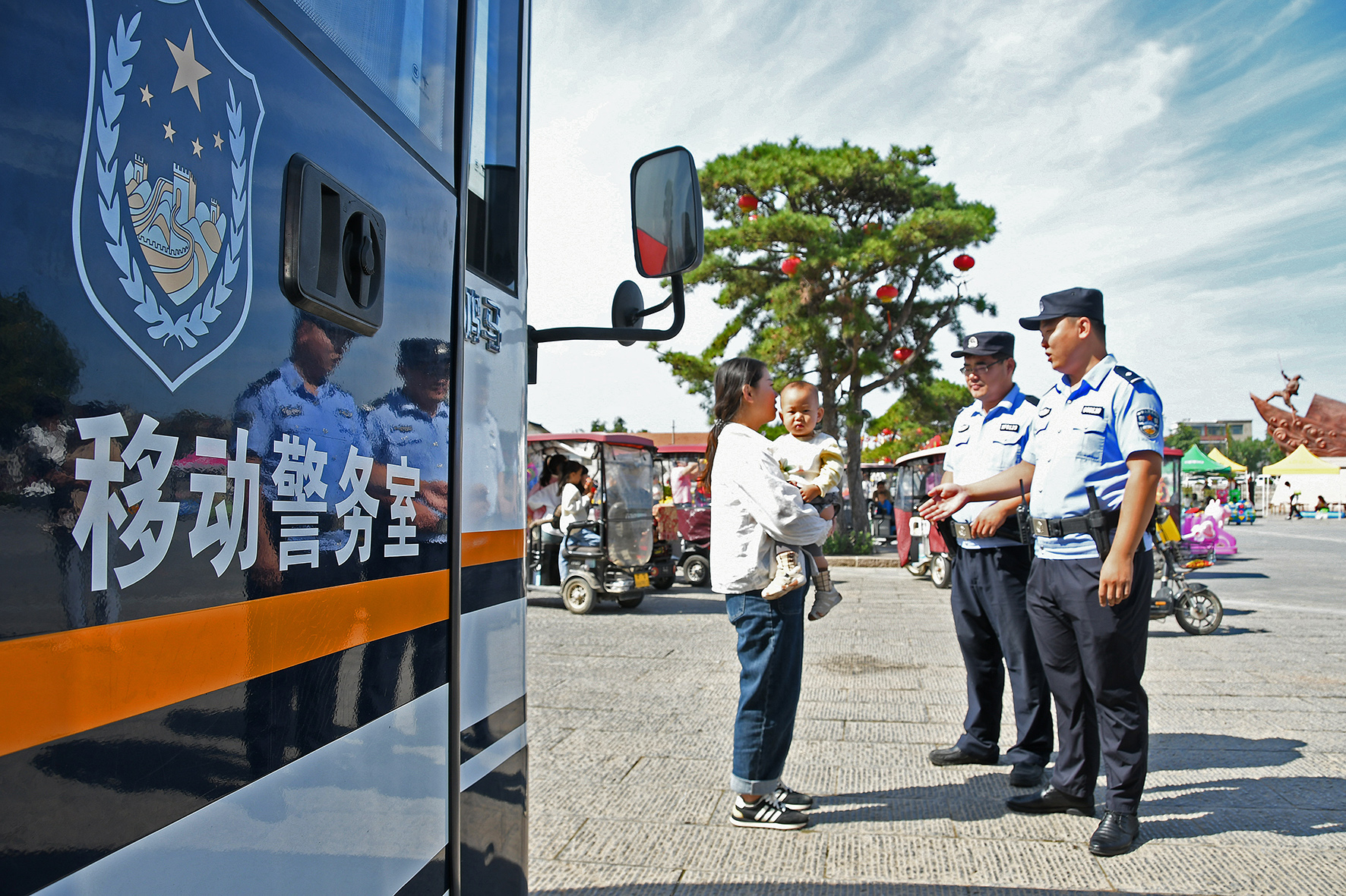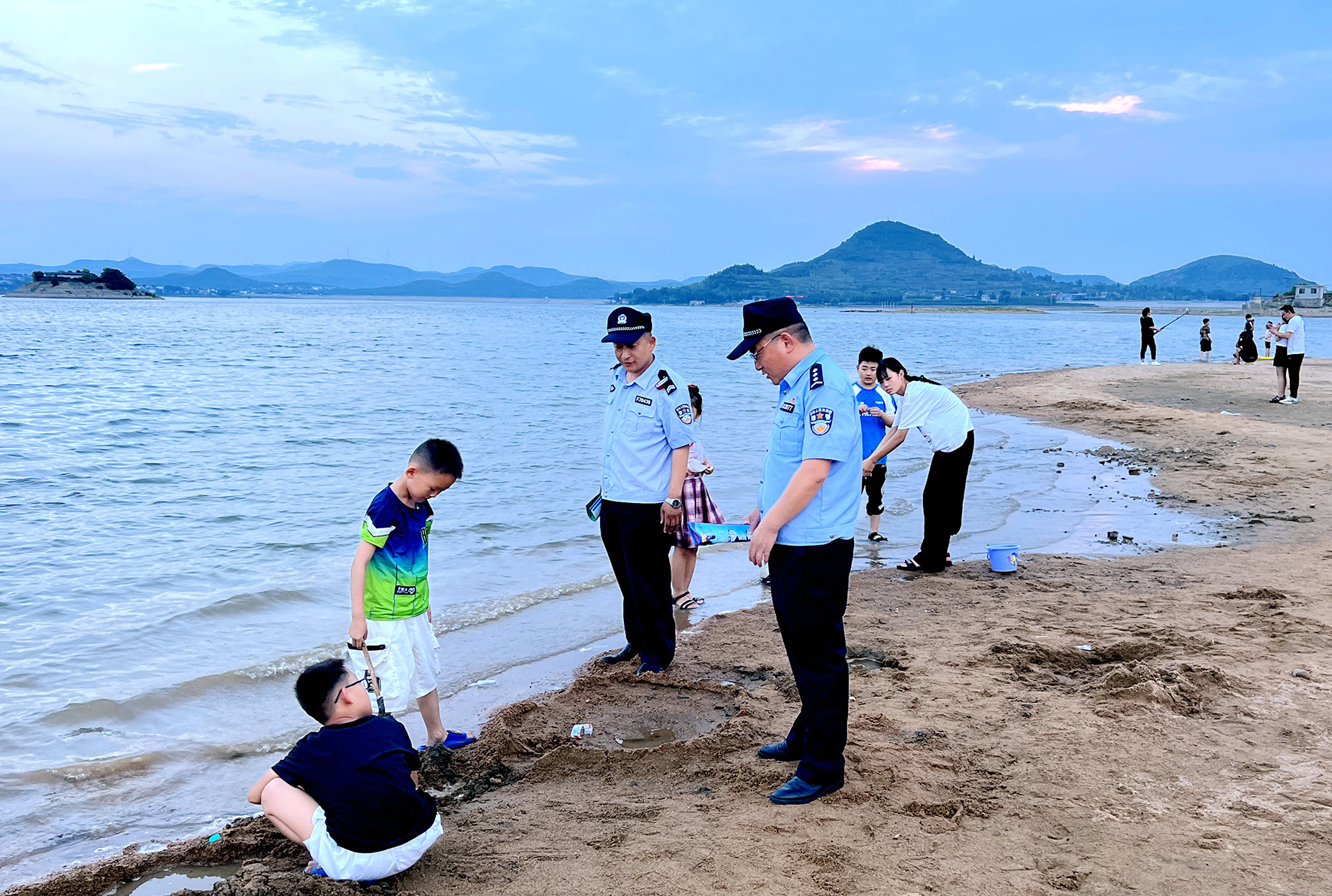 10月5日,山東省棗莊市公安局山亭分局馮卯派出所民輔警在巖馬湖畔開(kāi)展巡邏防控,提醒小朋友注意安全。