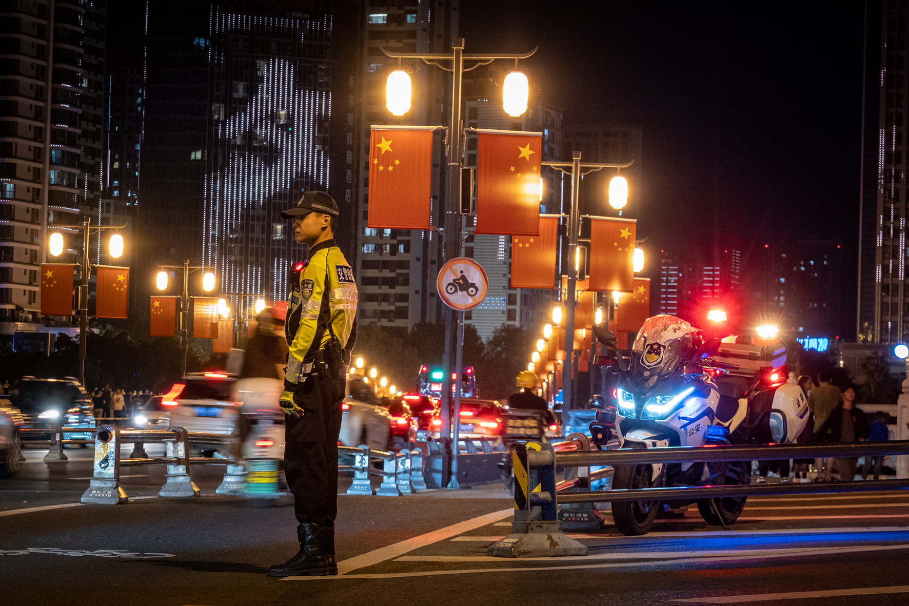 10月2日晚,四川省綿陽(yáng)市公安局交警支隊(duì)執(zhí)勤民警在越王樓景區(qū)附近疏導(dǎo)交通。