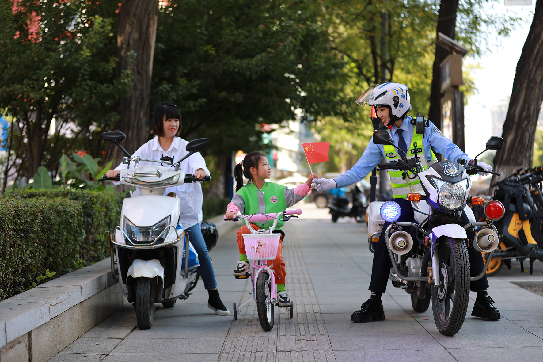 10月5日,遼寧省阜新市公安局交警支隊(duì)海州大隊(duì)女子騎警隊(duì)民警加強(qiáng)節(jié)日?qǐng)?zhí)勤,叮囑小朋友注意騎行安全。