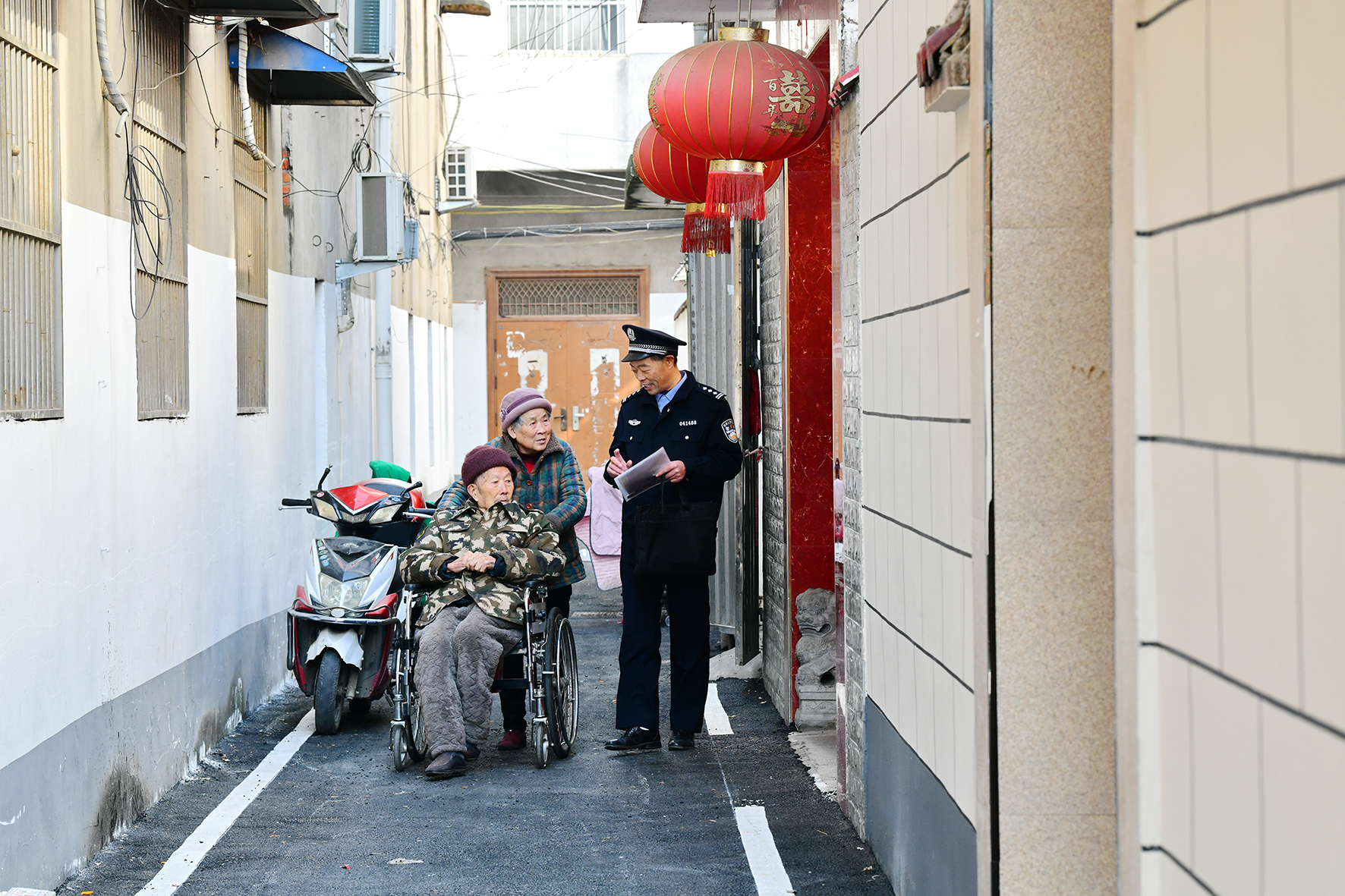11月28日,安徽省阜南縣公安局城關(guān)派出所社區(qū)民警王振洲在紅旗社區(qū)居民區(qū)向居民了解治安情況。