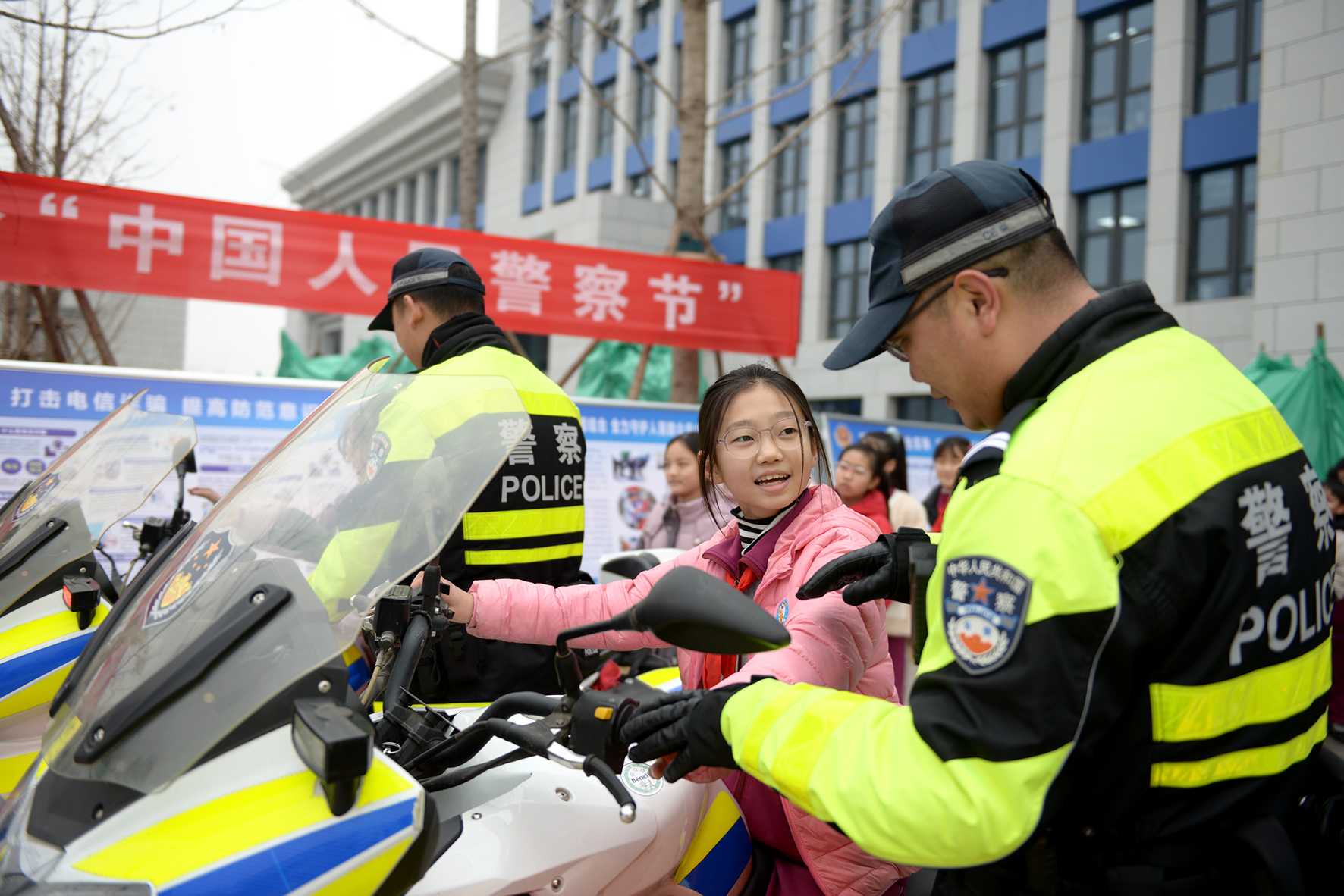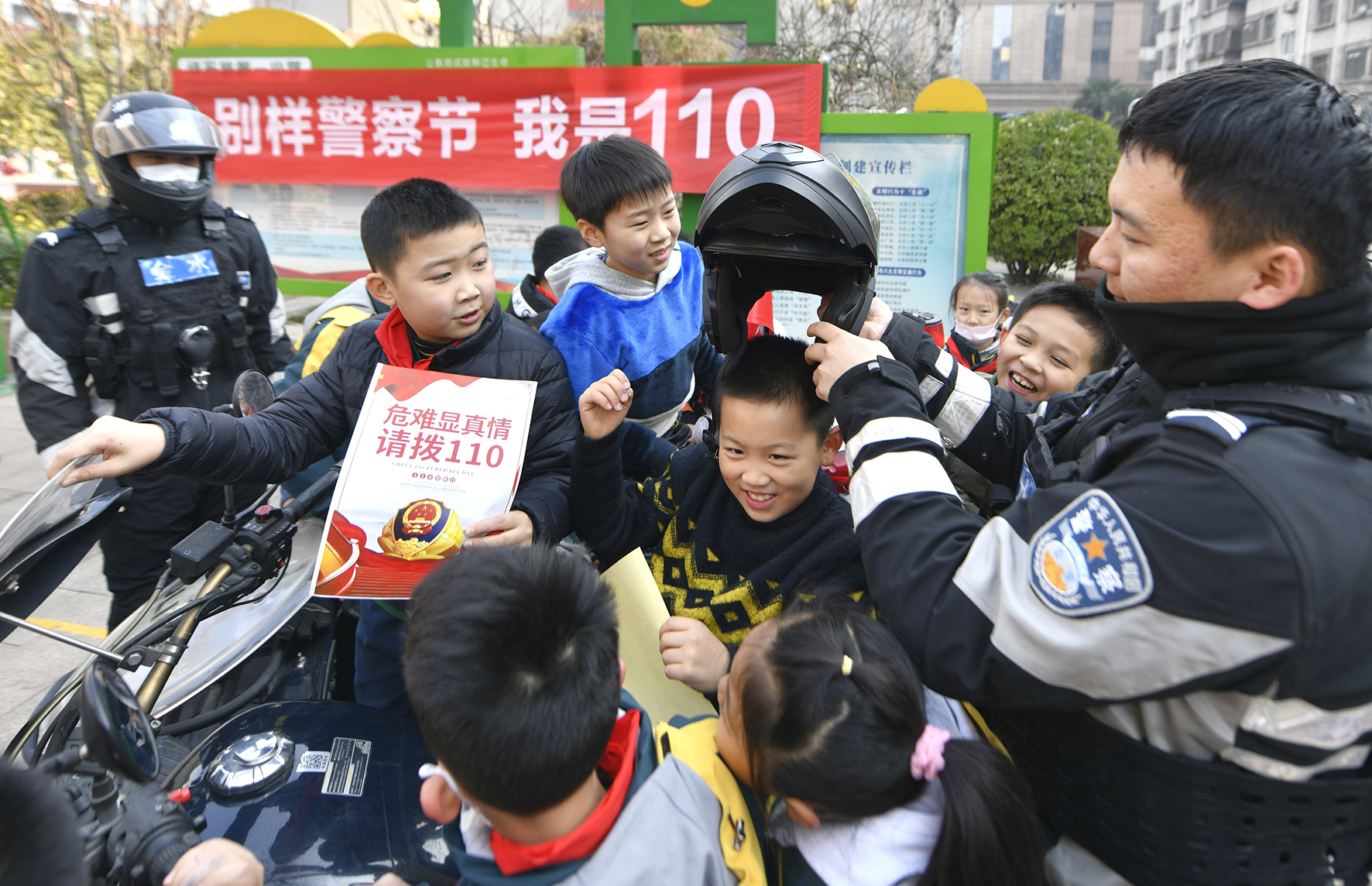 1月9日,河南省鄭州市公安局金水分局巡特警大隊隊員們走進緯五路第一小學,與師生們共同開展“別樣警察節(jié) 我是110”宣傳活動。