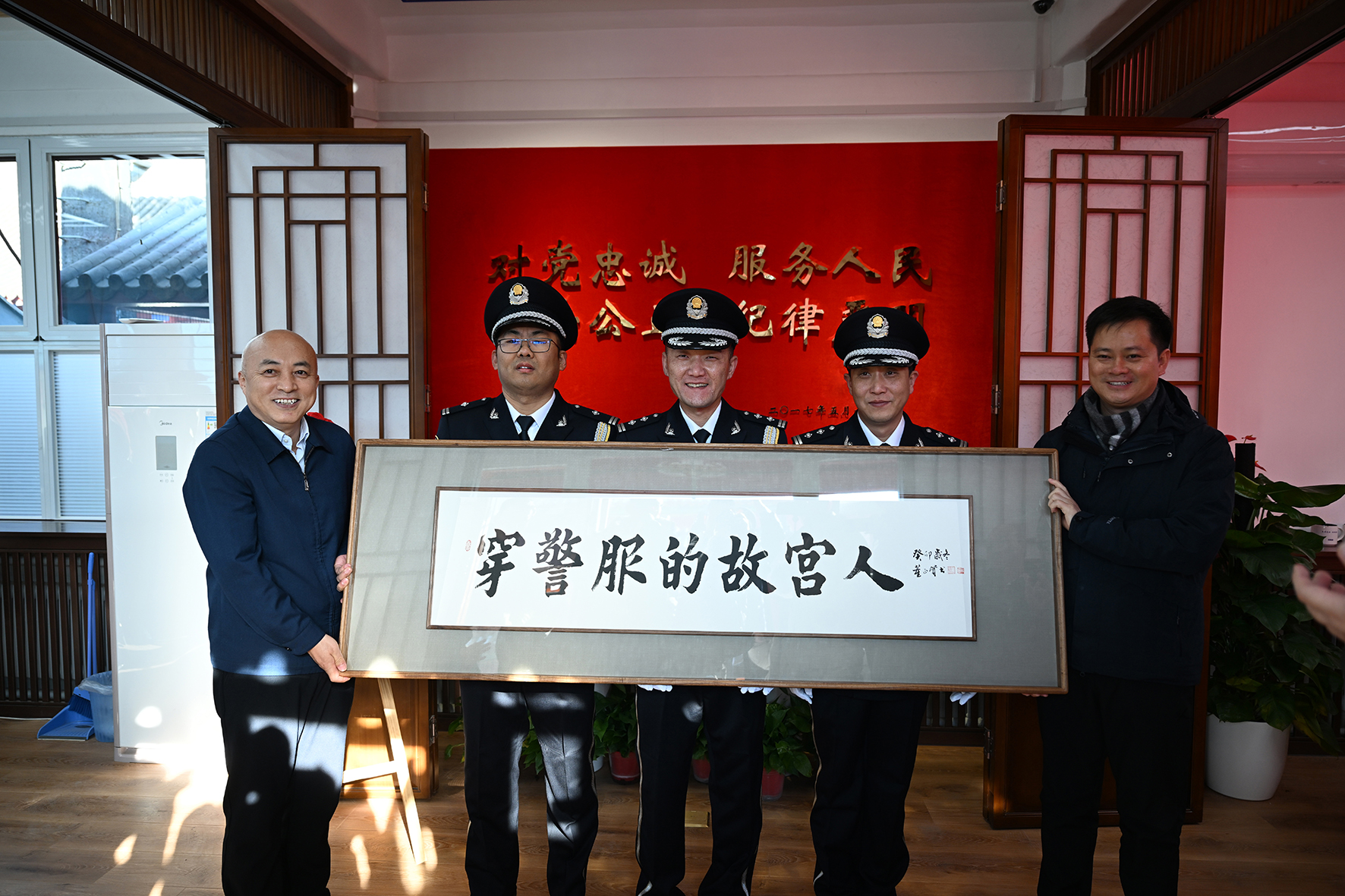 1月10日,第四個(gè)中國人民警察節(jié)。文化和旅游部黨組成員、故宮博物院院長王旭東(左一)看望慰問故宮派出所民警,并將“穿警服的故宮人”牌匾送到民警手中。