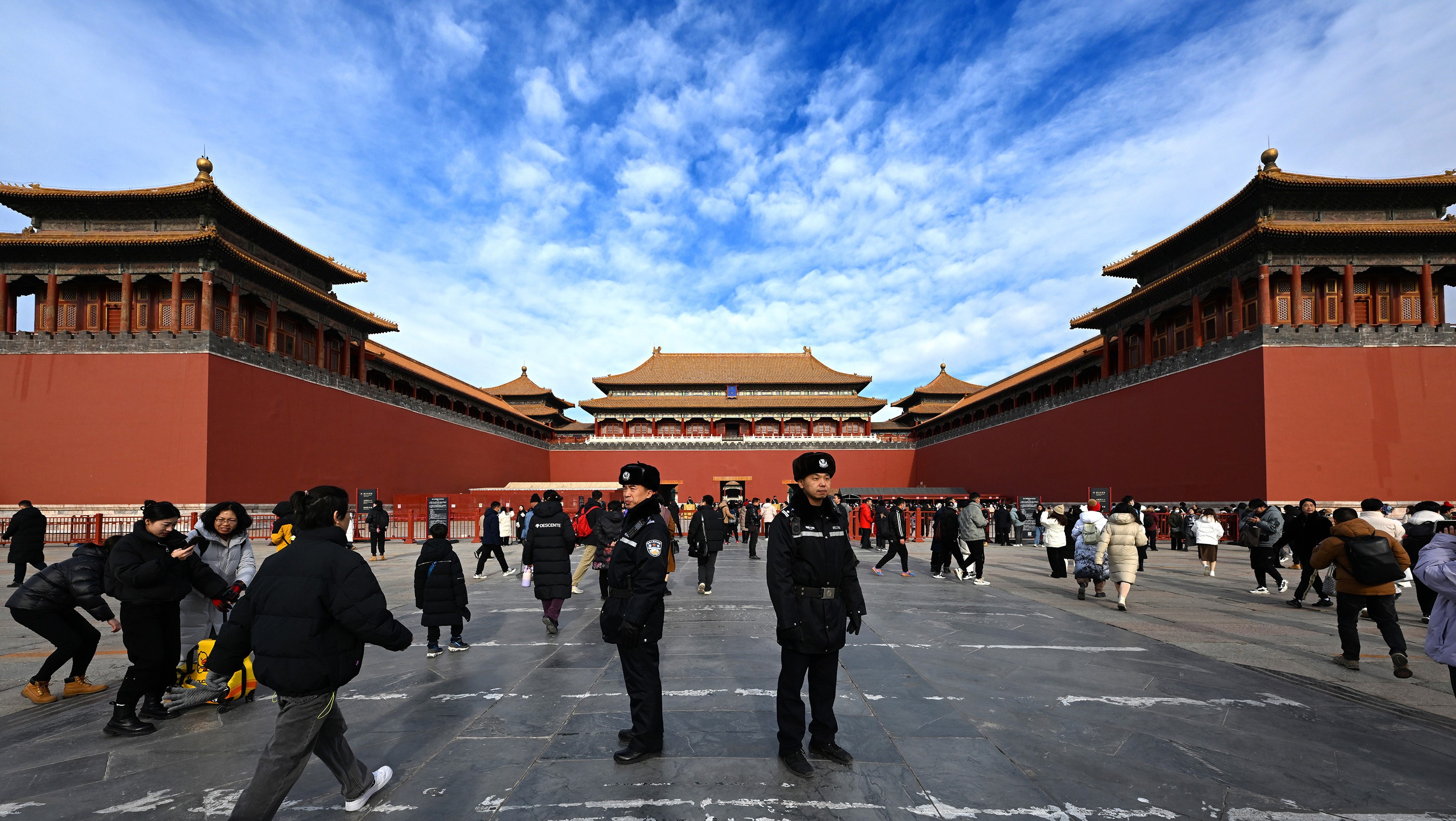 民警在進(jìn)入午門的安檢通道前維持秩序。