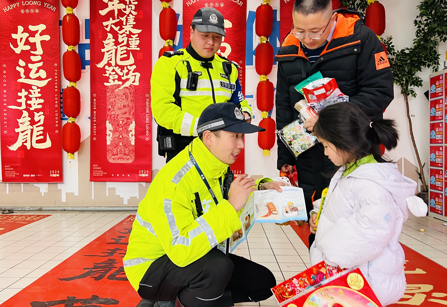 圖為2月20 日,民輔警在赤城路一家超市門口向市民宣傳交通安全知識(shí)。