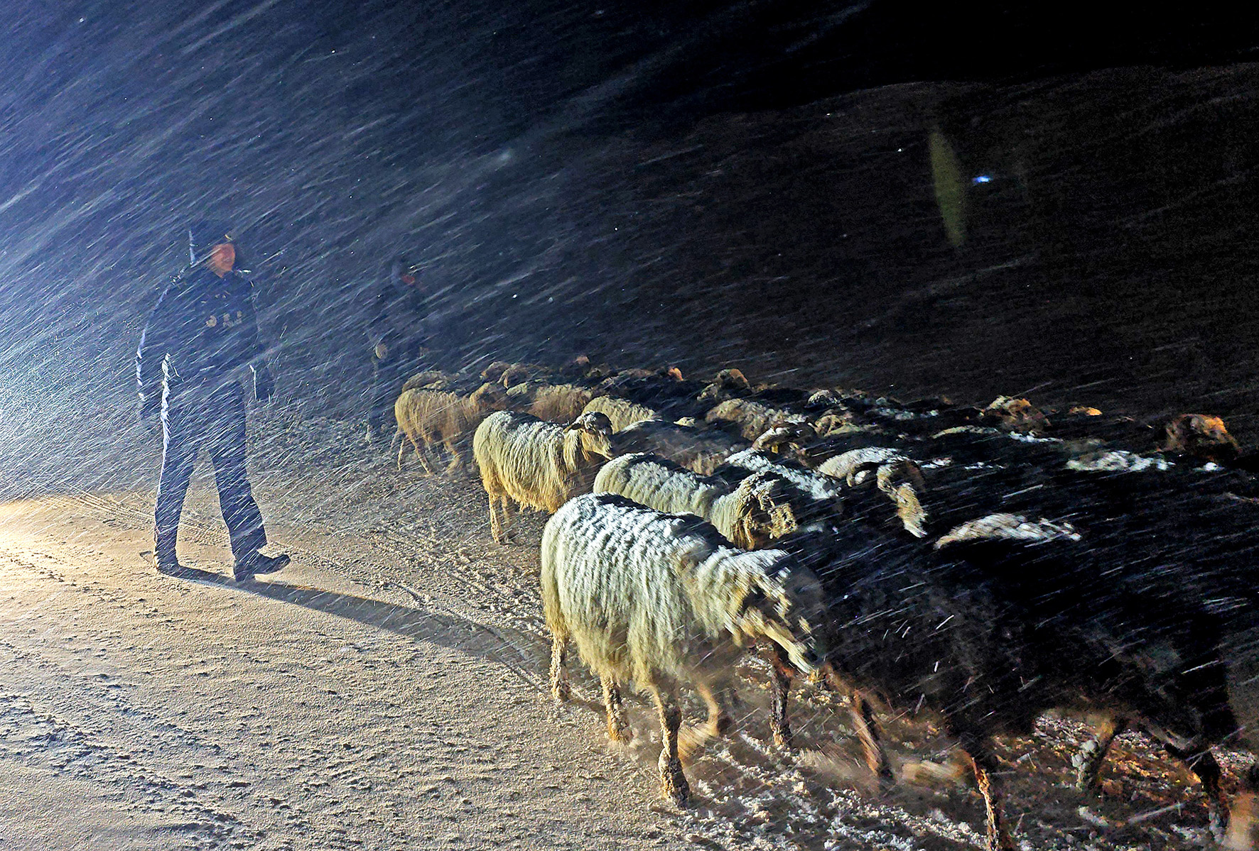 2月16日晚,新疆伊犁夏特邊境派出所接到牧民轉(zhuǎn)場途中遭遇暴風雪被困的報警求助,民警們經(jīng)過三個小時的長途跋涉,成功將牧民和1000余只牲畜平安護送至定居點。