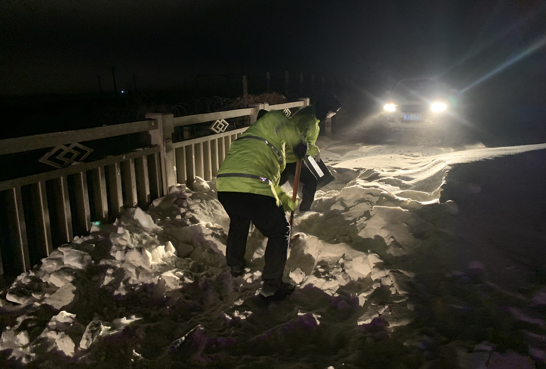 2月16日晚11時許,新疆克拉瑪依市公安局白堿灘區(qū)分局民警冒著風雪救援被困車輛和群眾。