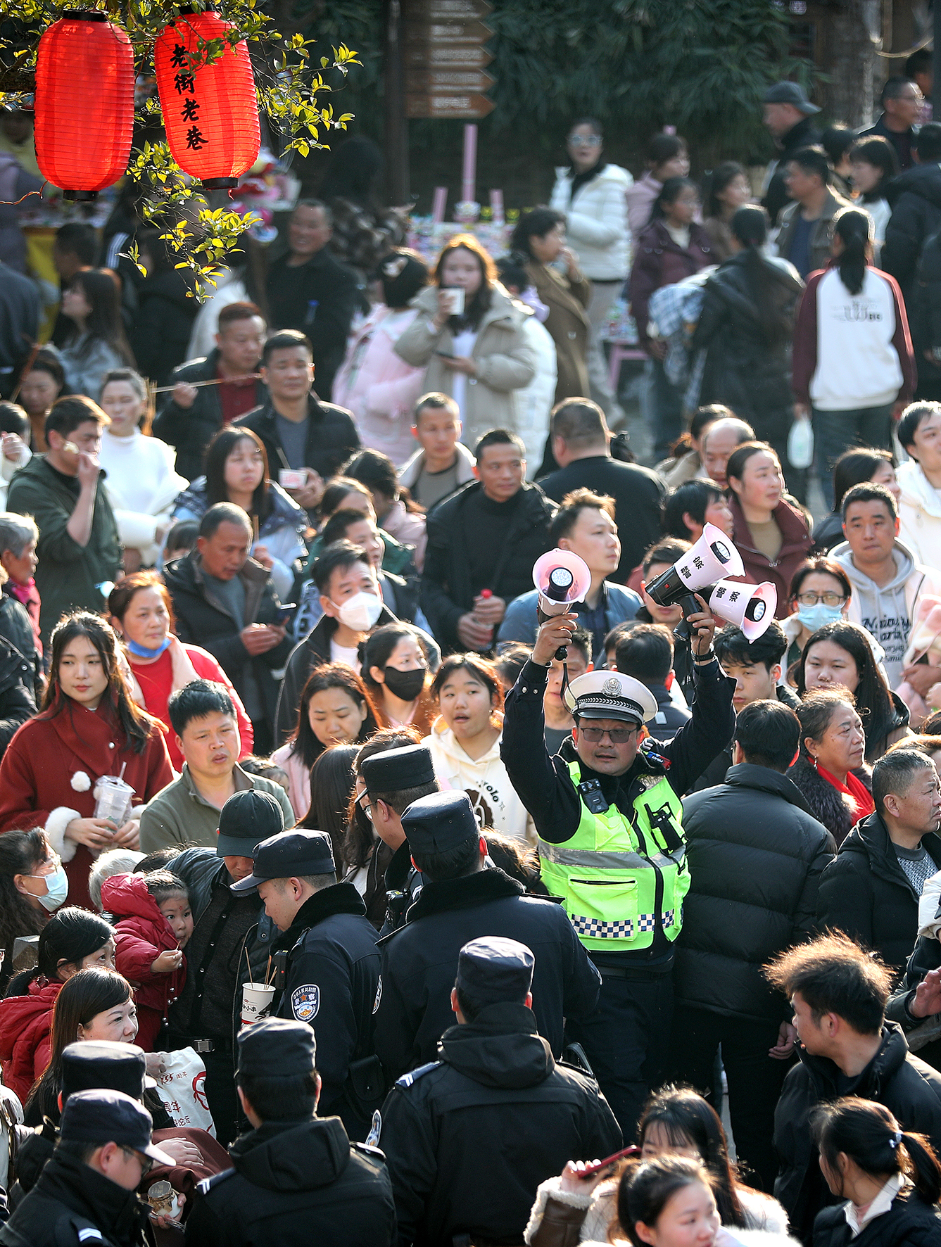 2月12日,湖北省鐘祥市公安局交警大隊民警在景區(qū)用“小喇叭”提醒游客注意安全。