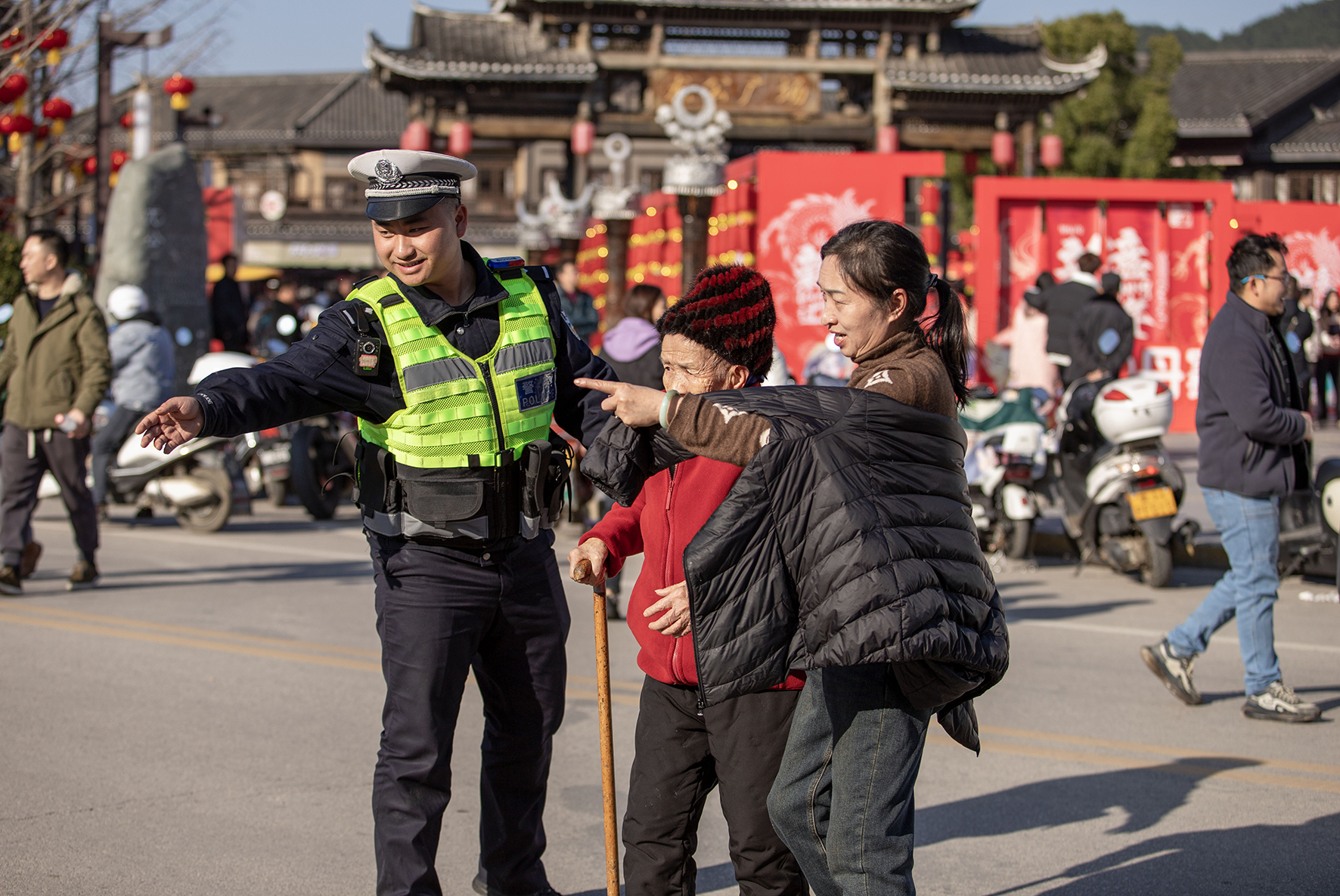 2月16日,上海市公安局崇明分局建設派出所民警在東平國家森林公園門口護送行動不便的老人過馬路。