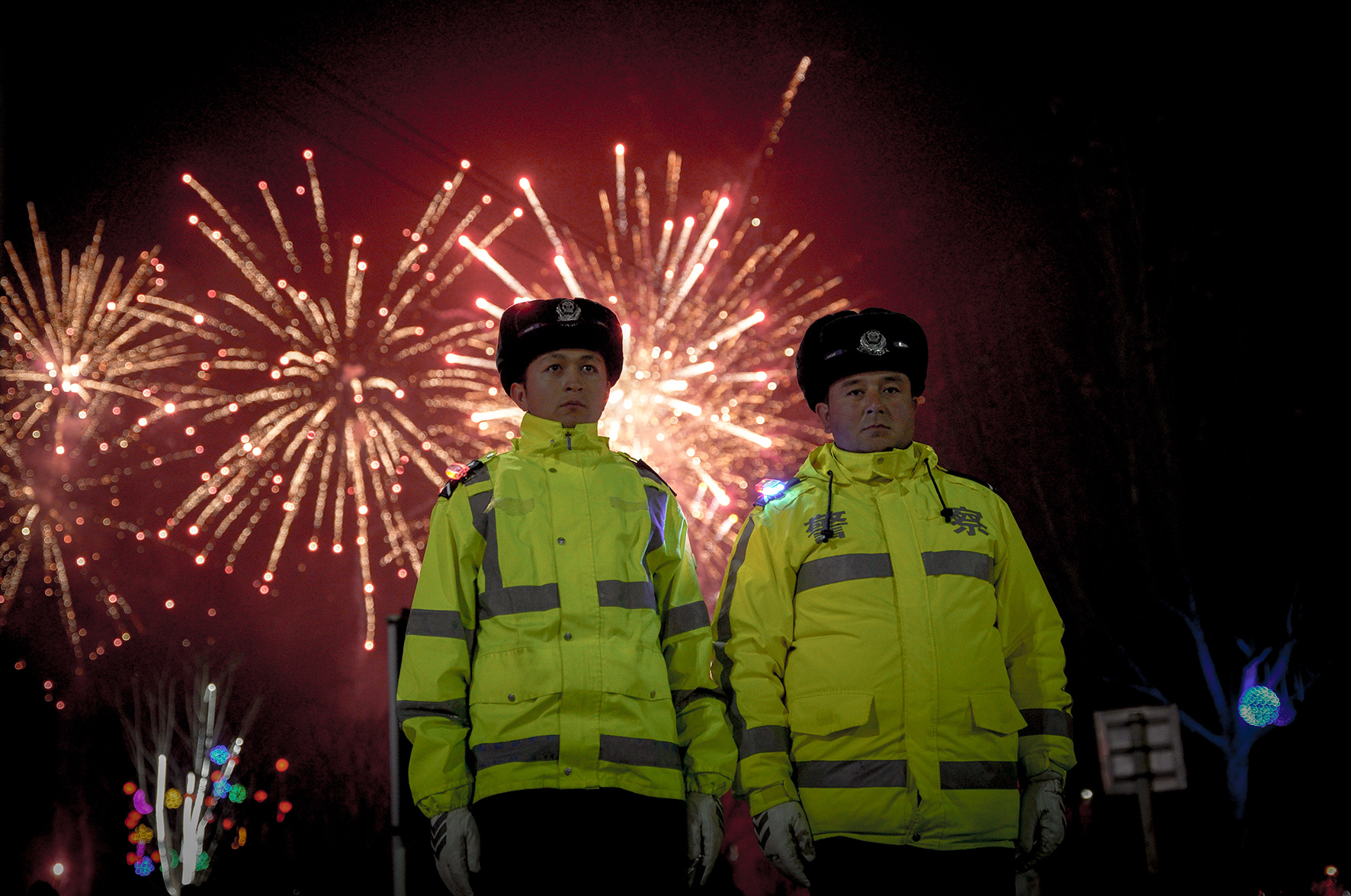 2月24日,新疆皮山縣石榴廣場舉行煙花表演。皮山交警堅守崗位,確保群眾歡度元宵。