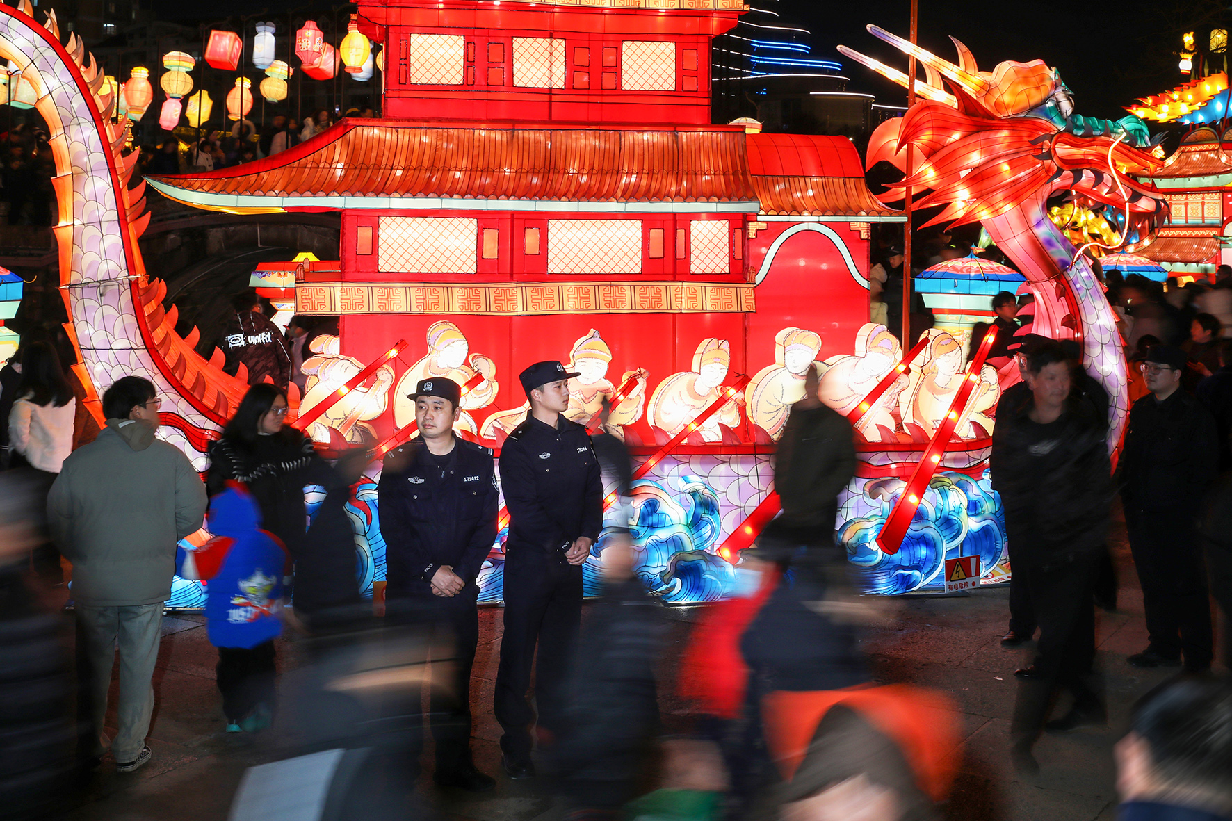 2月24日,江蘇泰州老街觀賞燈會的民眾絡繹不絕,泰州市公安局海陵分局精心組織好安保工作,守護平安。