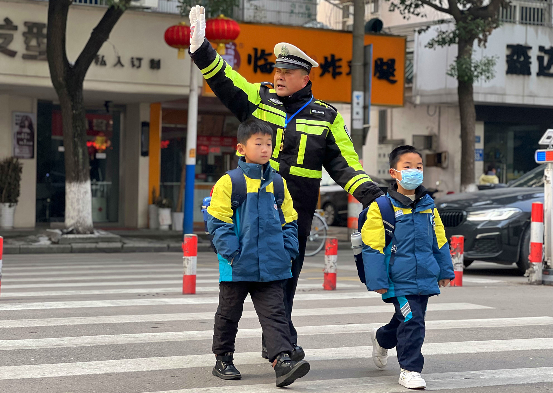 2月26日,安徽省當(dāng)涂縣公安局交管大隊(duì)民警在團(tuán)結(jié)街小學(xué)護(hù)送學(xué)生過斑馬線。