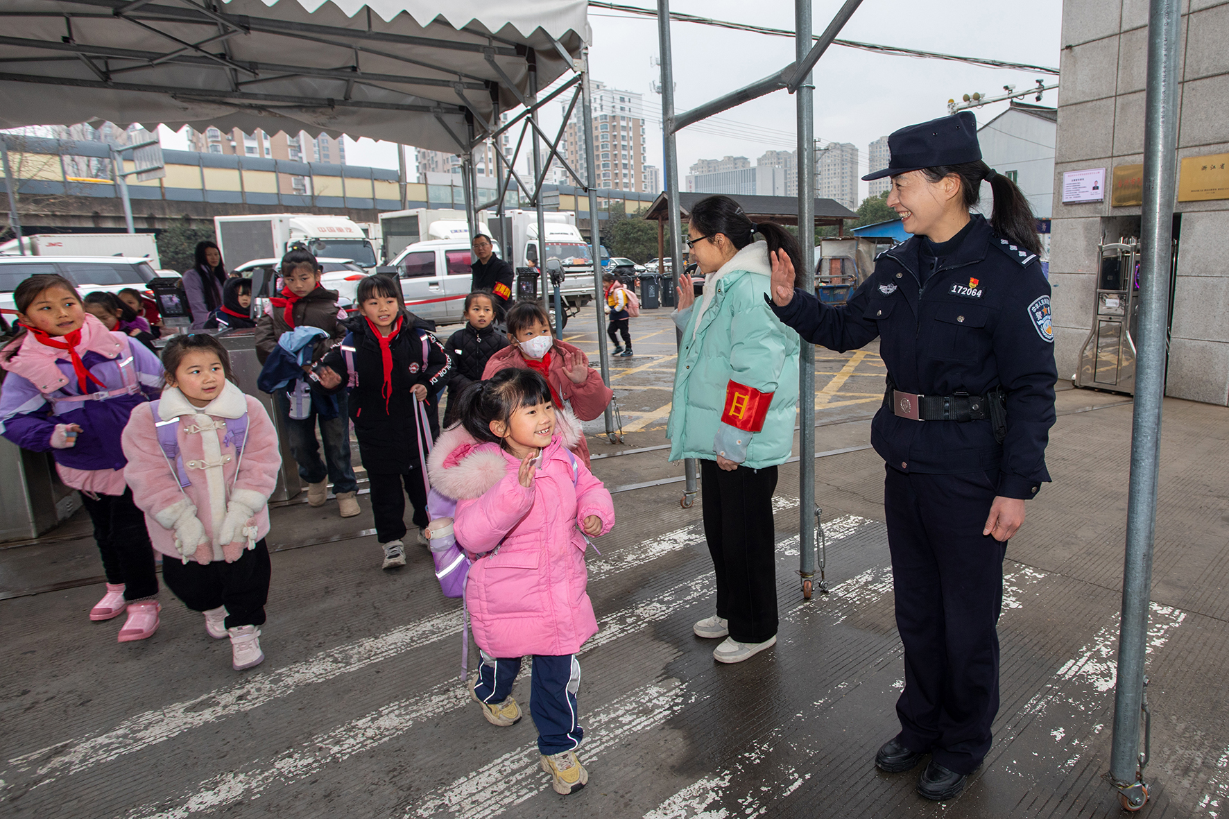 2月26日,安徽省蕪湖市弋江大隊(duì)女子護(hù)學(xué)崗民警在安師大附屬小學(xué)(西校區(qū))護(hù)送上學(xué)孩子過馬路,確保學(xué)生上放學(xué)安全。