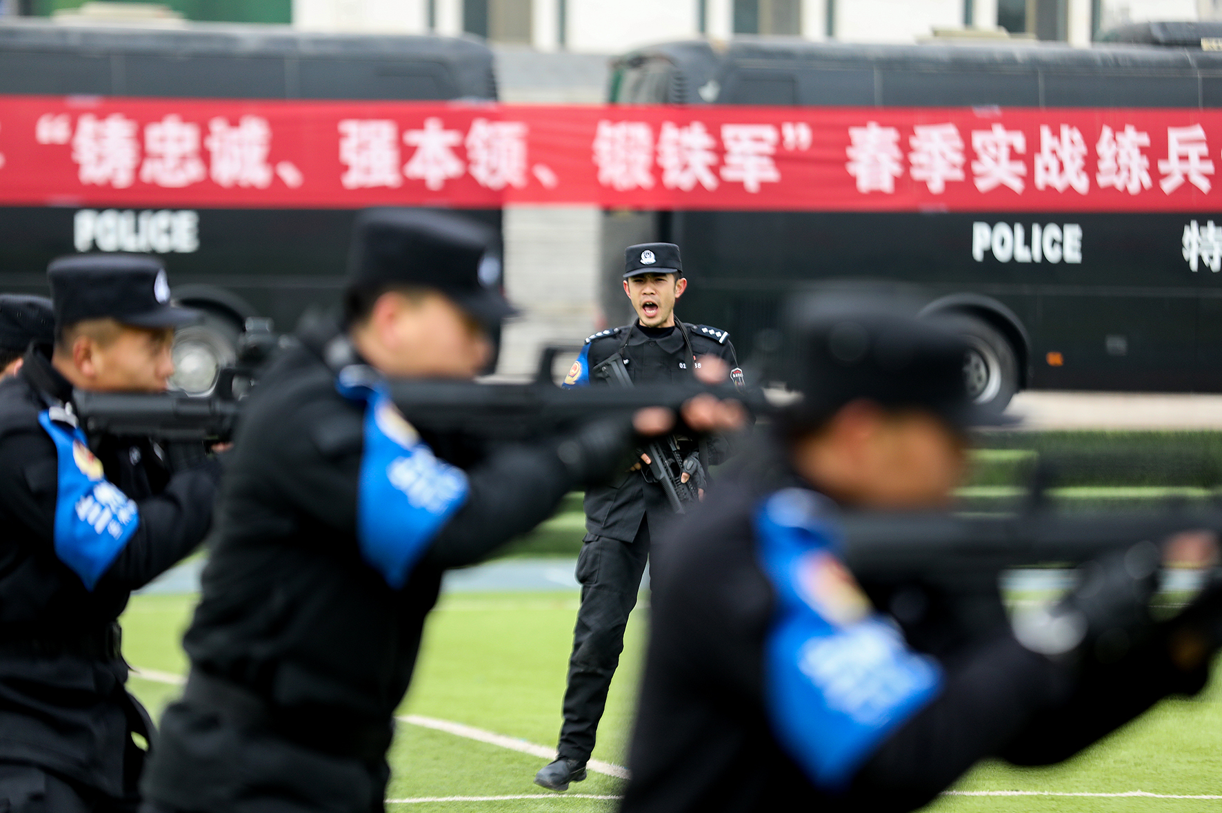 2月27日,甘肅蘭州市公安局特警隊伍開展春季實戰(zhàn)訓練,百名特戰(zhàn)隊員在訓練場上開展持槍戰(zhàn)術(shù)動作、突擊攻堅戰(zhàn)術(shù)、盾棍叉小組戰(zhàn)術(shù)、無人機操作、體能對抗等多項警事技能訓練,拉開2024春季大練兵序幕。