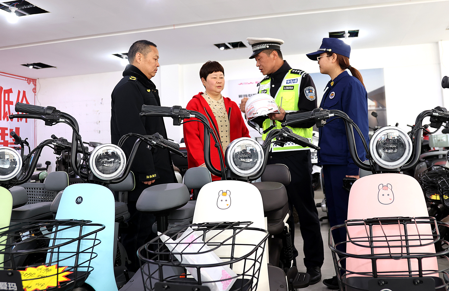 3月14日,陜西省大荔縣公安局交警大隊聯(lián)合市場監(jiān)管局、消防大隊,走進(jìn)轄區(qū)電動車銷售點開展電動車質(zhì)量安全和頭盔質(zhì)量等宣傳檢查。