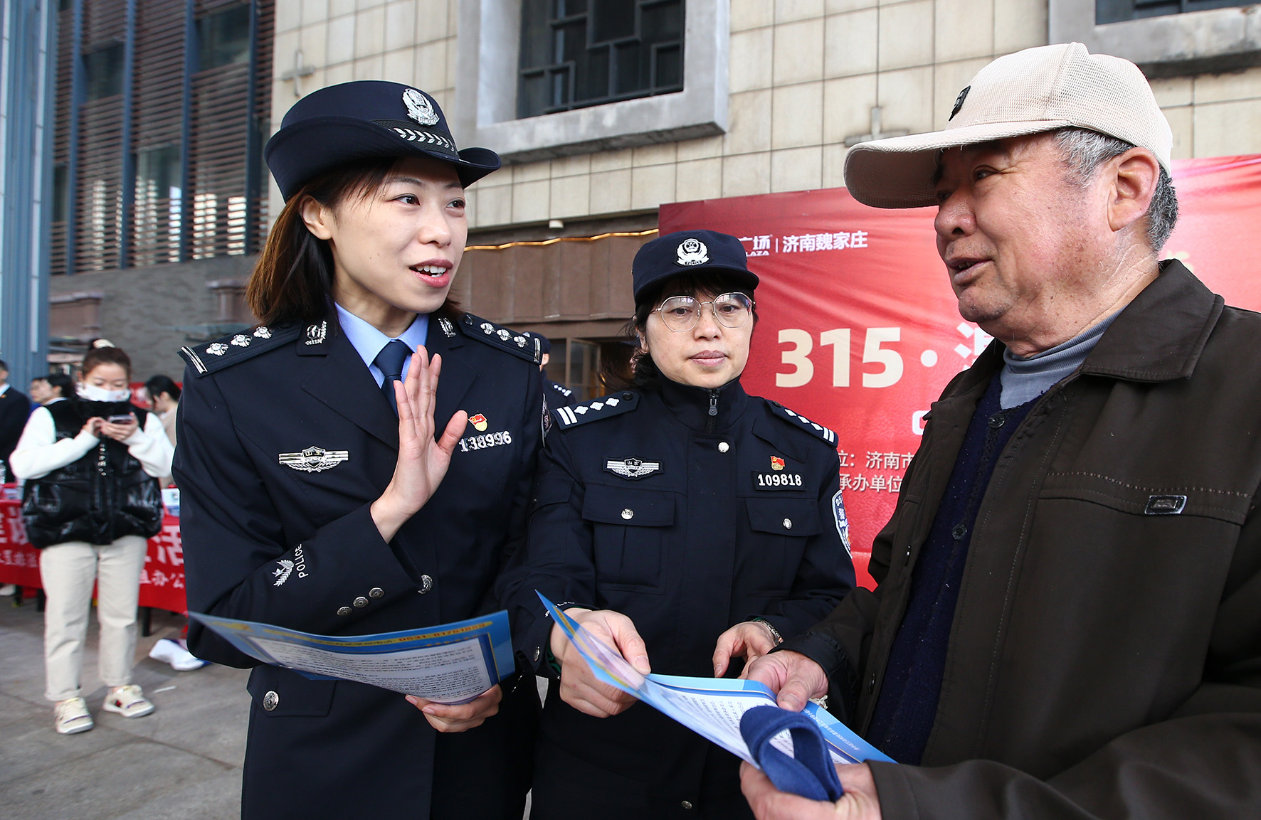 3月14日,在山東省濟(jì)南市經(jīng)四路萬達(dá)廣場,濟(jì)南市公安局市中區(qū)分局聯(lián)合市中區(qū)市場監(jiān)管局等相關(guān)單位開展迎接“3?15”國際消費者權(quán)益日活動。