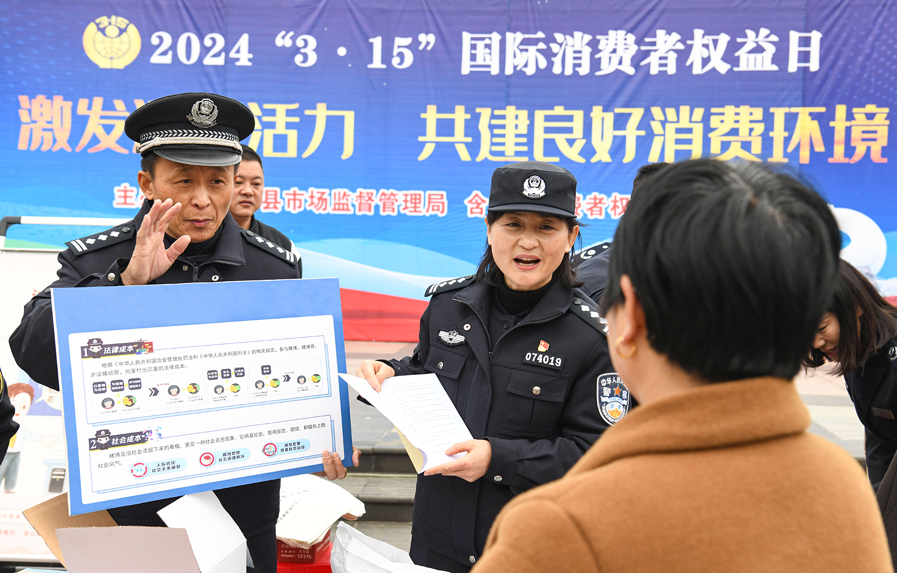 3月14日,安徽省含山縣公安局、市場監(jiān)督管理局等部門在玉龍廣場聯(lián)合開展“國際消費者權(quán)益日”宣傳活動。