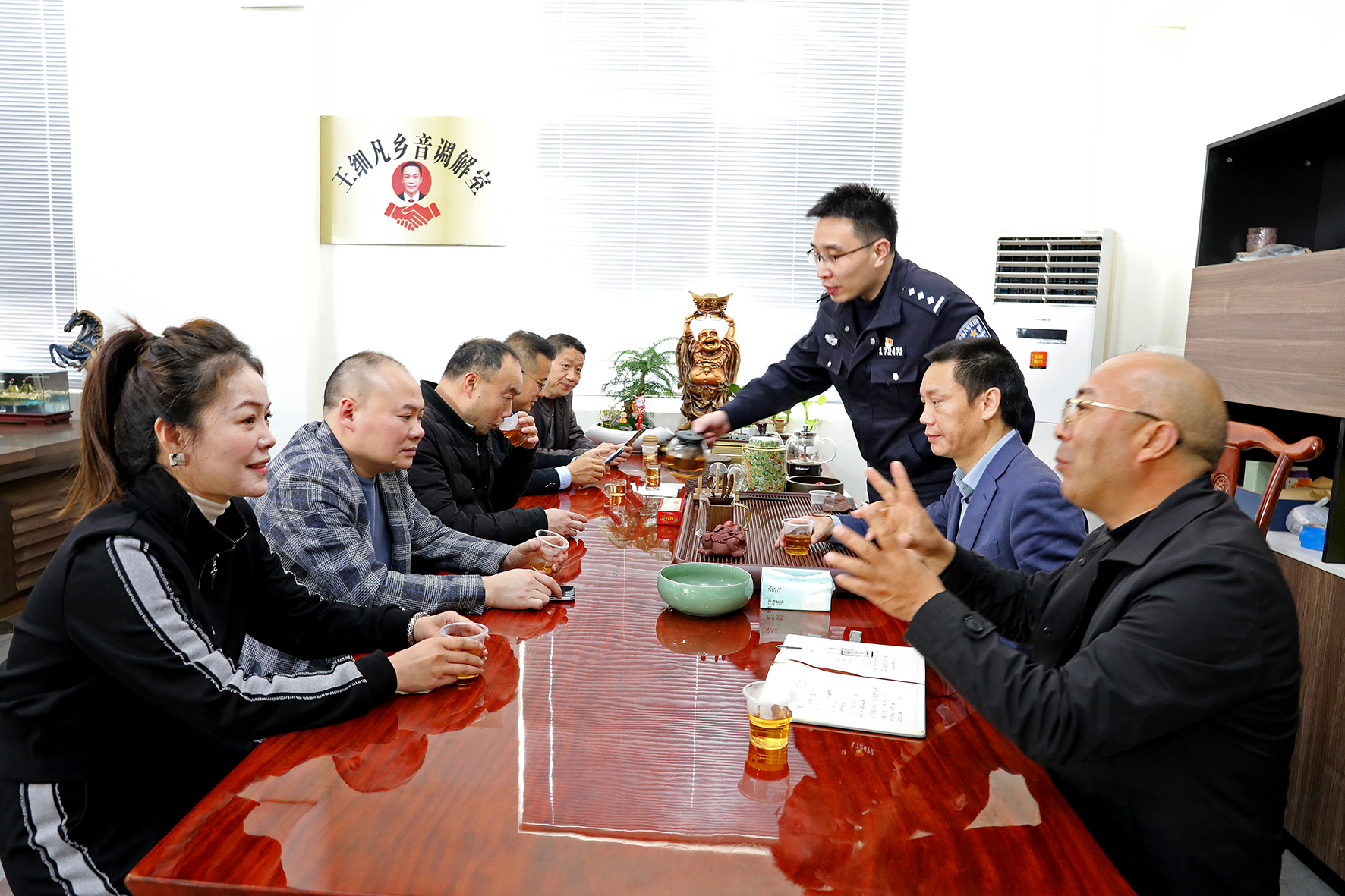 圖為3月19日,以王細凡個人命名的湖北籍鄉(xiāng)音調(diào)解室邀請杜橋派出所社區(qū)警務(wù)隊民警和專職調(diào)解員為“鄉(xiāng)音鄉(xiāng)情”調(diào)解員講解工作技巧。