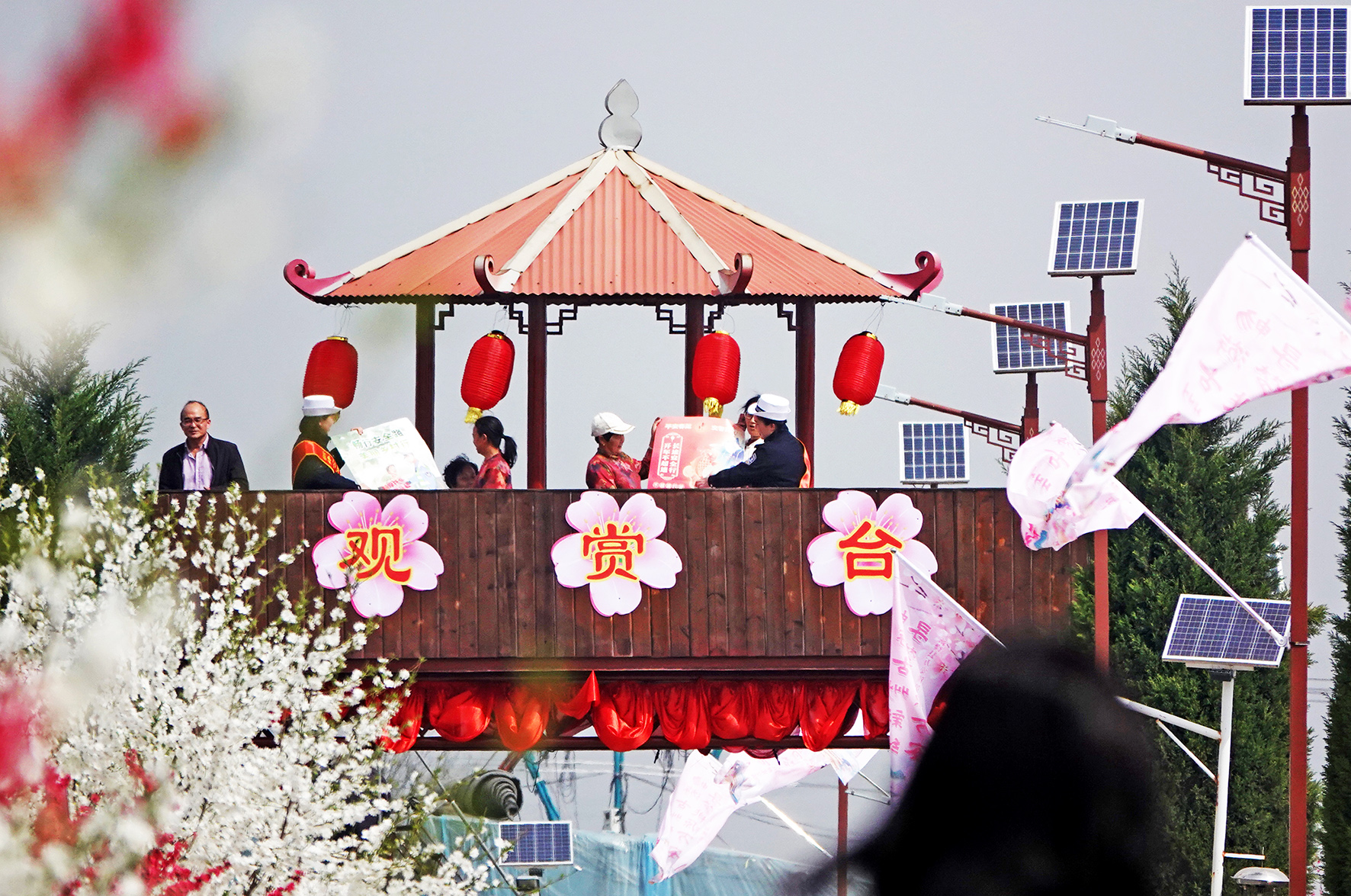 4月1日,山西省運城市新絳縣公安交警大隊民輔警在新絳縣第十一屆桃花觀光交流會上向游客宣傳交通安全知識。