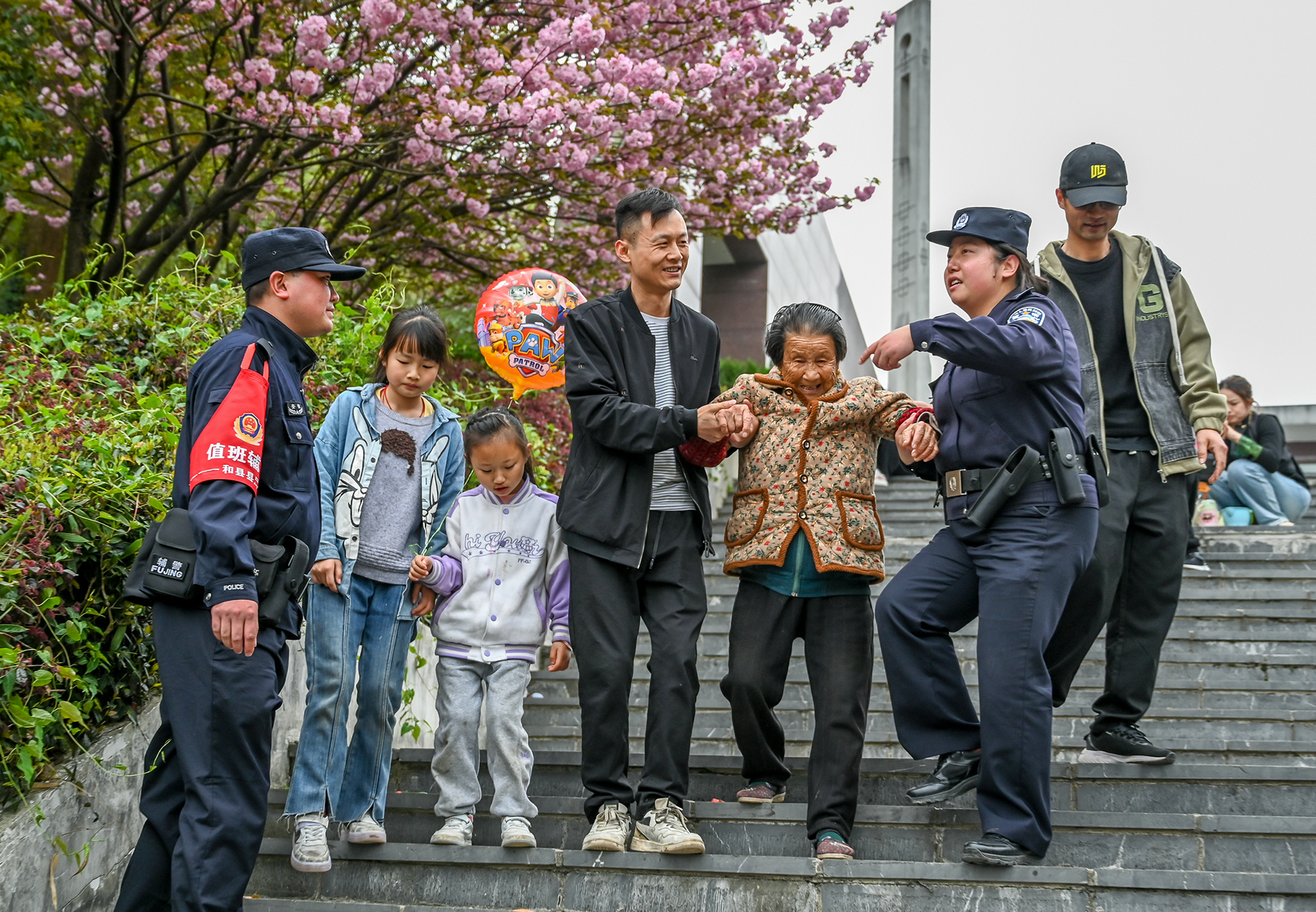 4月5日,安徽省馬鞍山市和縣公安局民警在西梁山革命烈士紀(jì)念館前幫助出行不便的群眾。