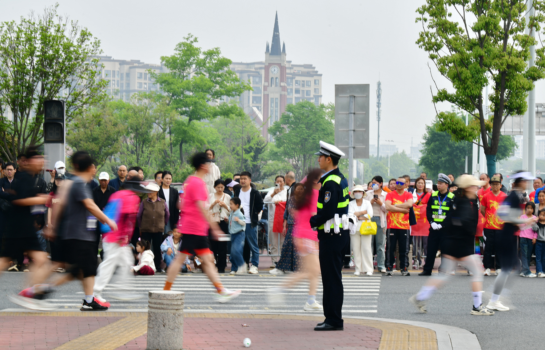 4月21日,安徽省阜陽市公安機關民輔警在阜陽馬拉松比賽現場維持秩序。