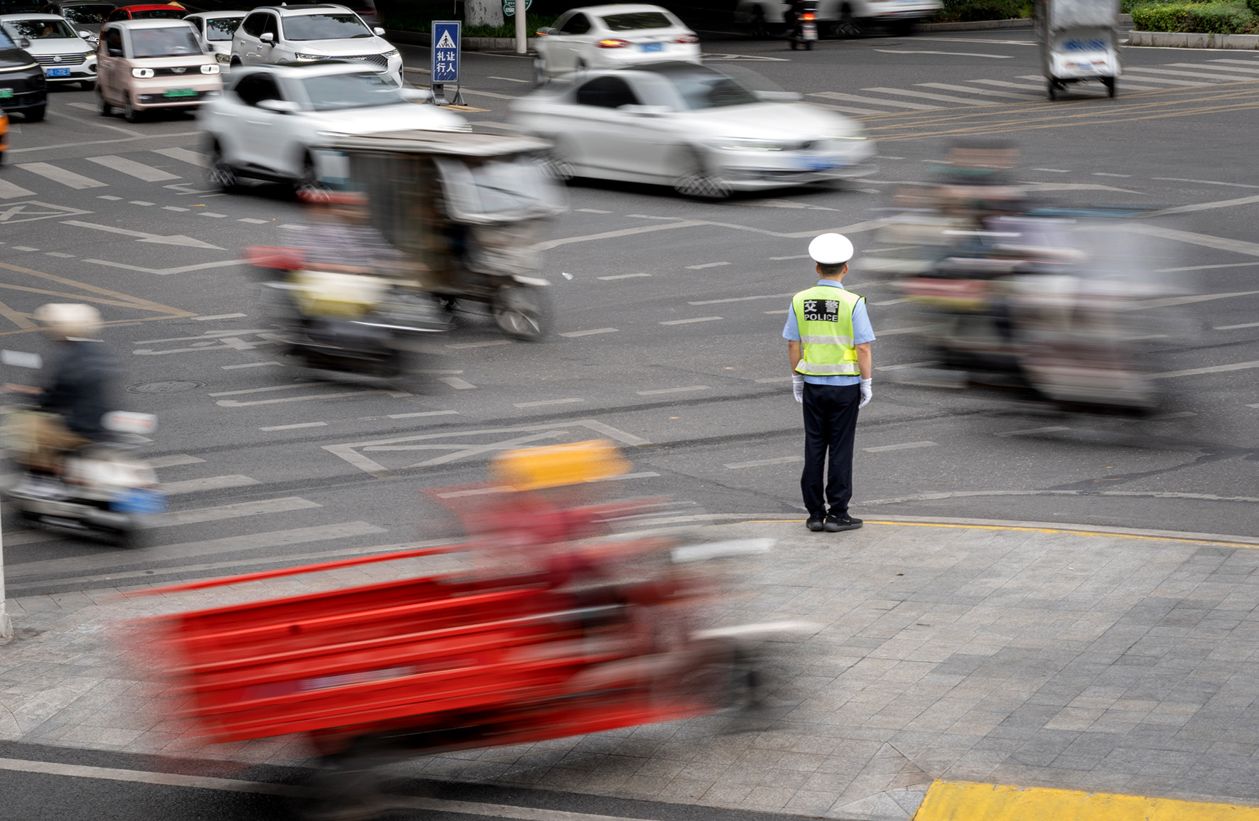 5月1日,四川省綿陽(yáng)市公安局交警支隊(duì)民警在涪城區(qū)東方紅大橋十字路口執(zhí)勤疏導(dǎo)交通。
