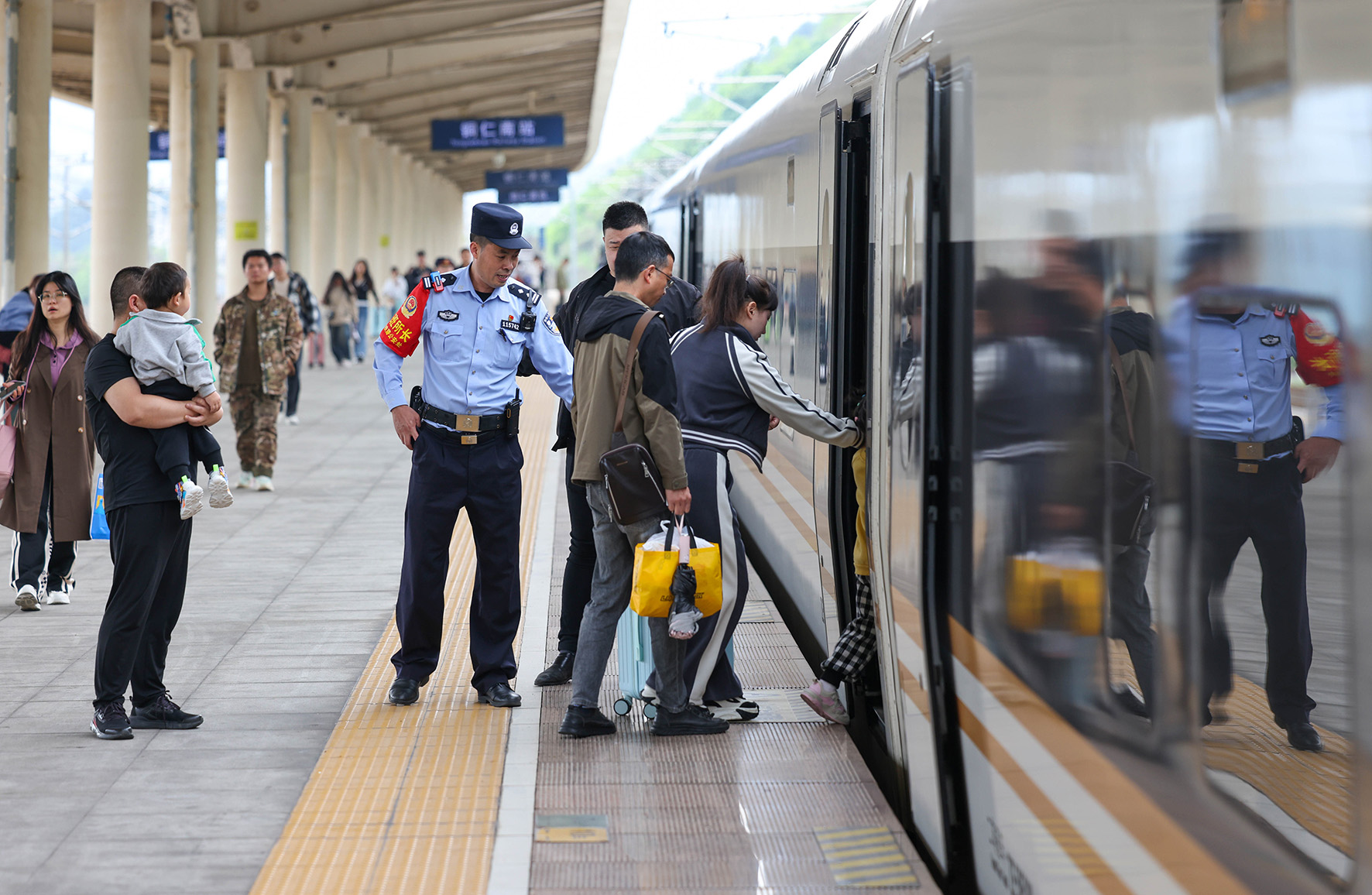 5月1日,在滬昆高鐵貴州銅仁南站,成都鐵路公安局貴陽(yáng)公安處銅仁南車站派出所民警在引導(dǎo)旅客乘車。
