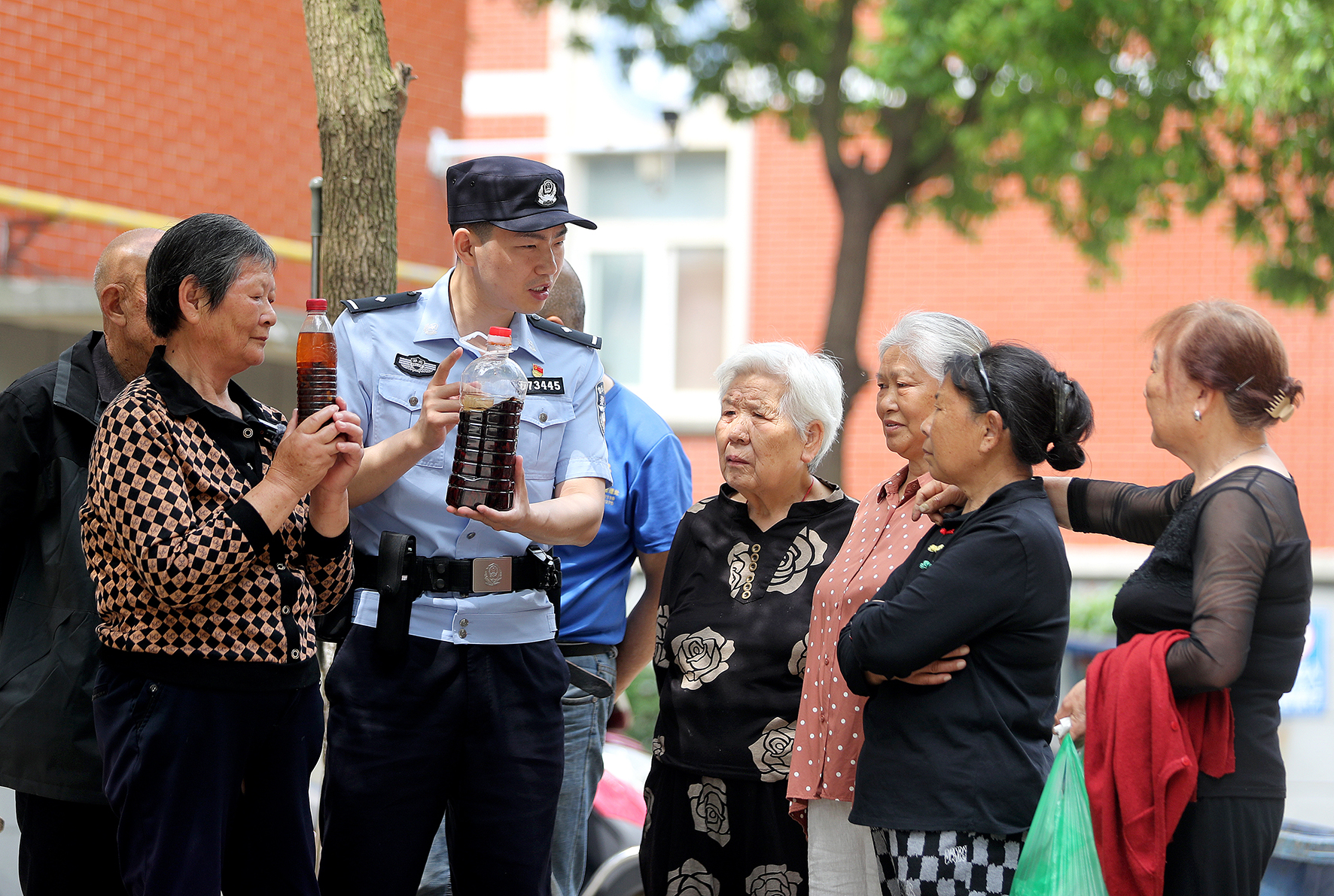 圖一:民警現(xiàn)場以案說法,向老年人講解“假藥酒”詐騙手段。