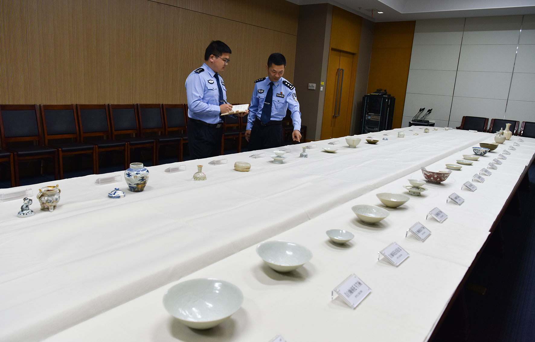 圖為景德鎮(zhèn)市公安局民警在現(xiàn)場清點文物。