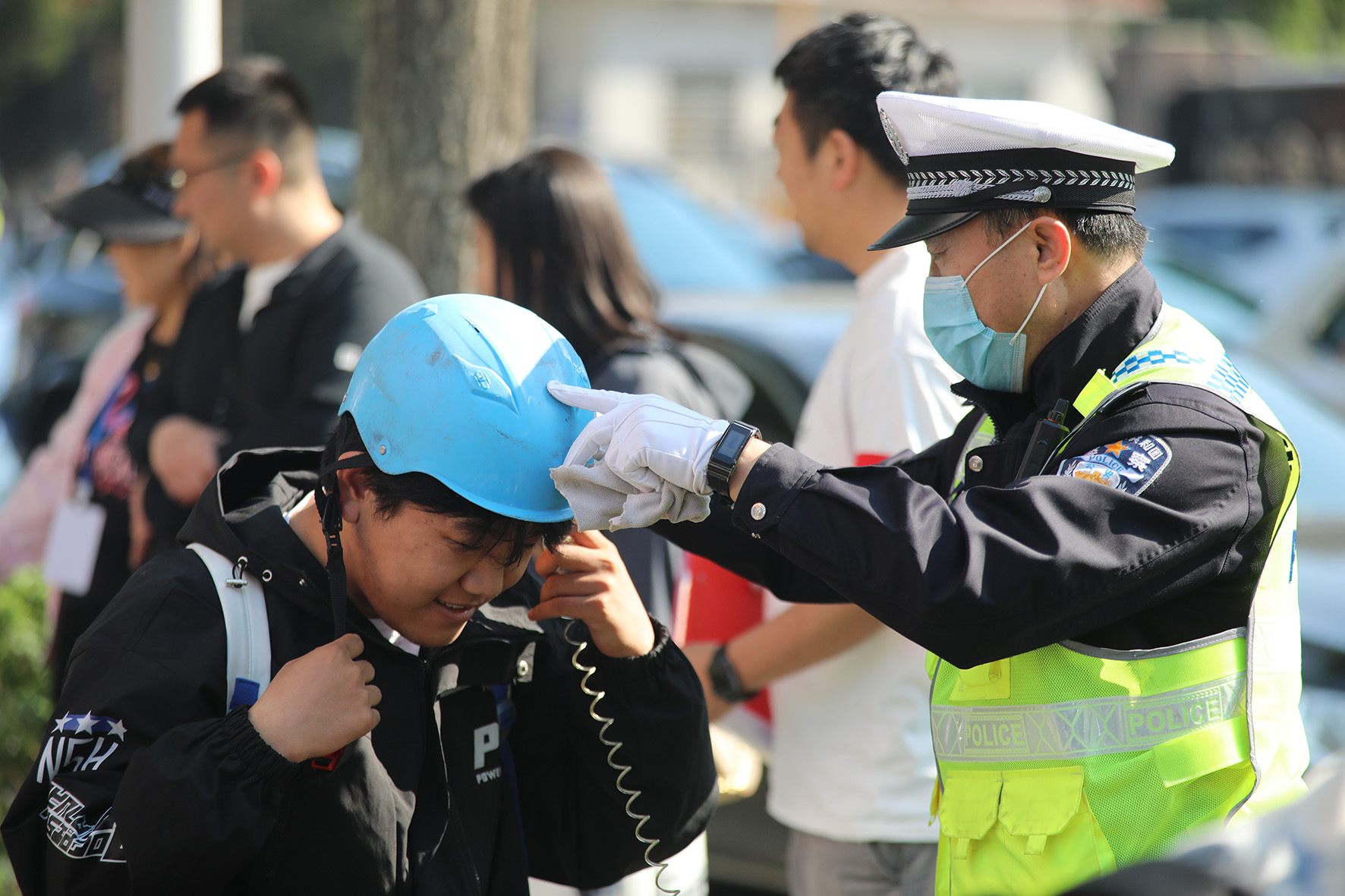 5月28日早高峰,遼寧省阜新市公安局局交警支隊細河大隊交警聯(lián)合民族街學校教師對騎乘電動車不戴頭盔違規(guī)出行的學生進行勸導教育。