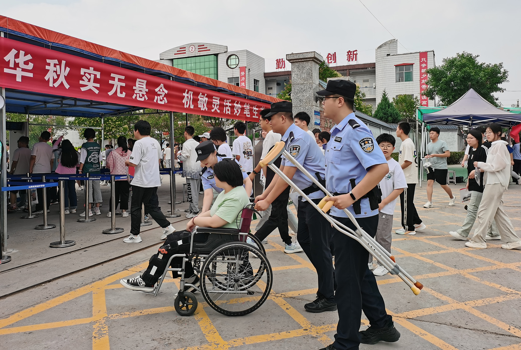 6月7日,甘肅省禮縣公安局特巡警在實驗中學考點護送一位行走不便的考生走出考場。