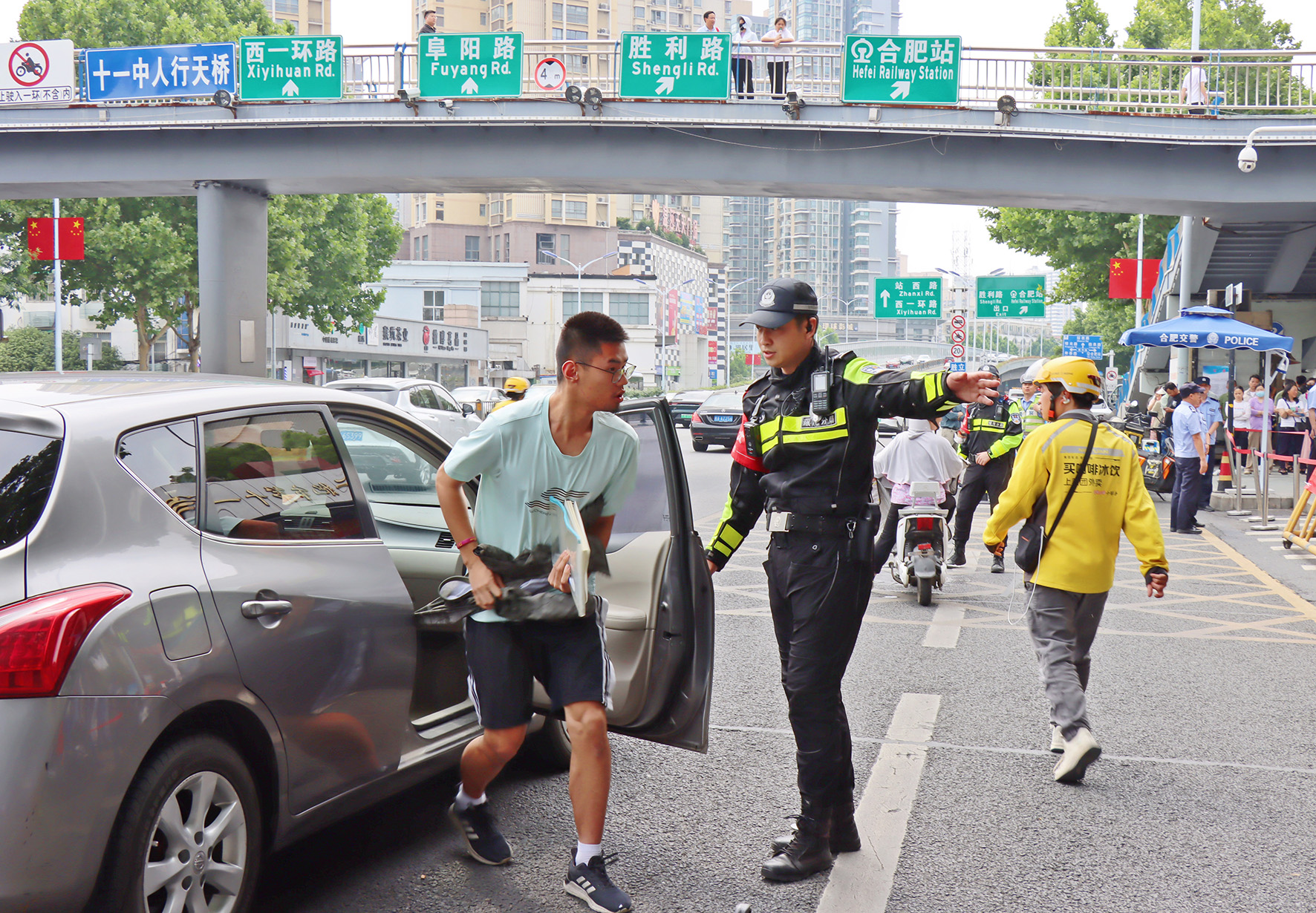 6月9日,安徽省合肥市公安局交警支隊民警在合肥考區(qū)八中考點外維護秩序。