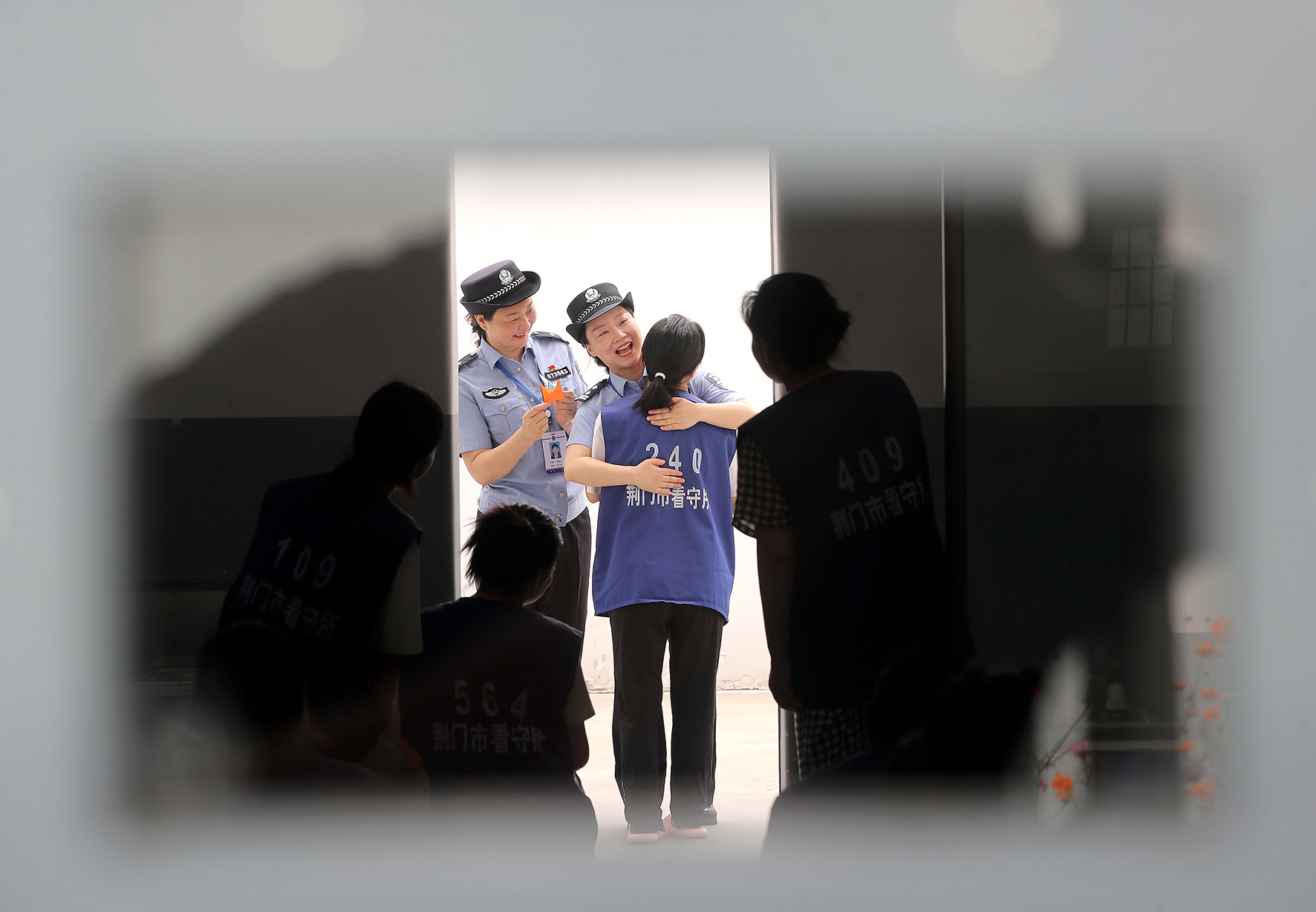 6月20日,在湖北省荊門市看守所女子監(jiān)區(qū)305監(jiān)室,管教民警將寫滿祝福和期望的“千紙鶴”送給在押人員小芬,并送上一個擁抱,祝福小芬35歲生日。