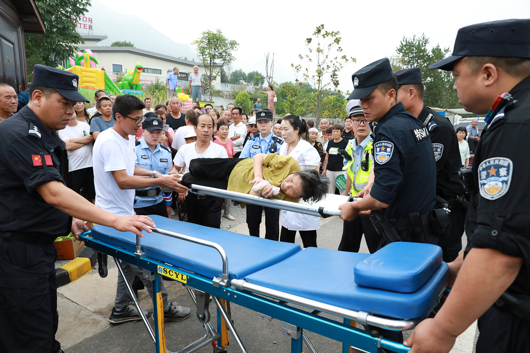 圖為執(zhí)勤民輔警與醫(yī)護人員正在救助一名昏厥的游客。