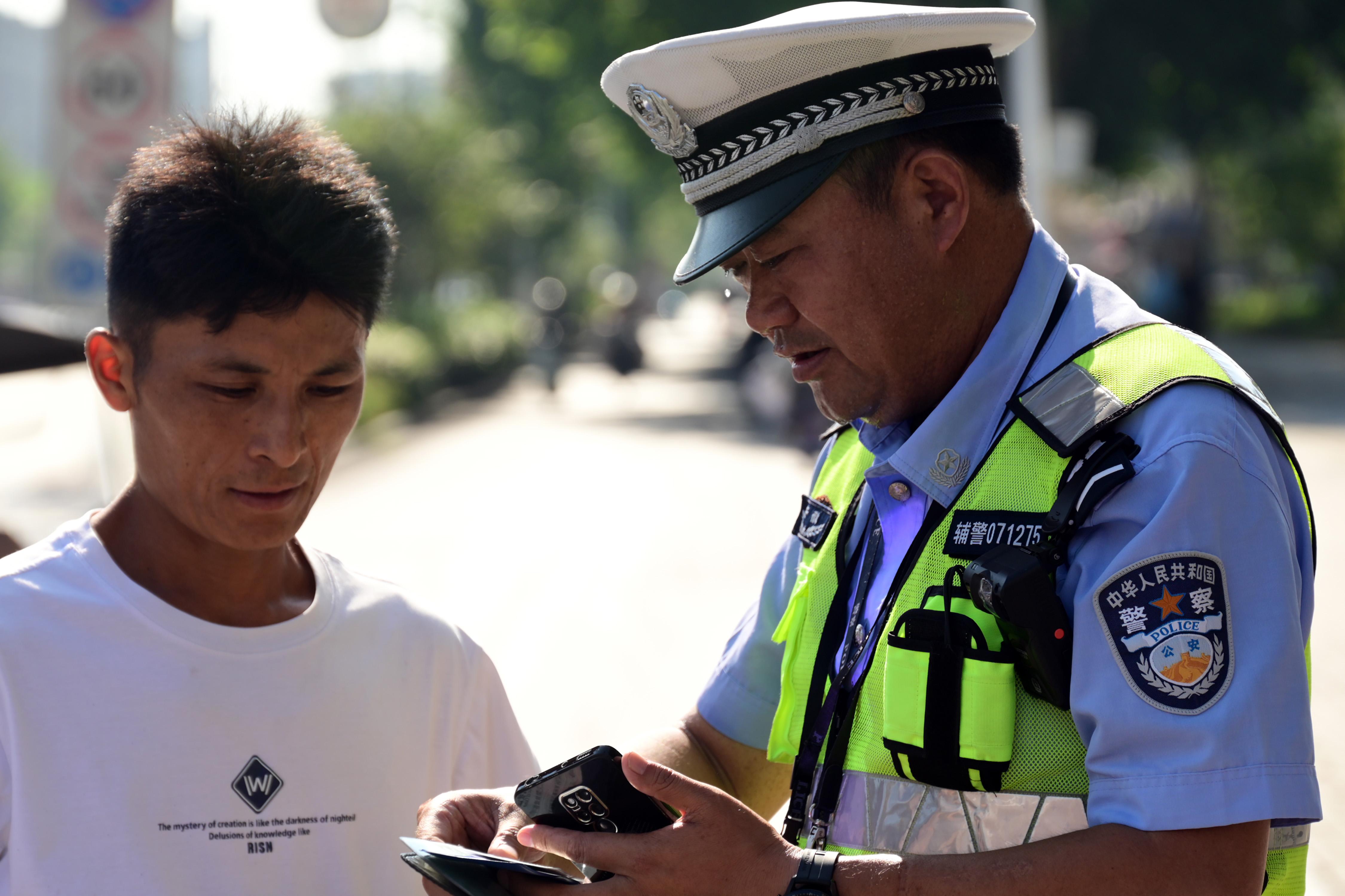 8月5日,安徽省固鎮(zhèn)縣公安局交管大隊的民警輔警冒著38攝氏度高溫在澮河路指揮疏導交通、提示安全駕駛。
