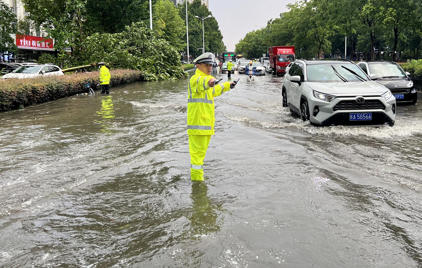 圖為合肥市公安局交警支隊(duì)蜀山大隊(duì)民警正在積水路段排查隱患,維護(hù)交通秩序。