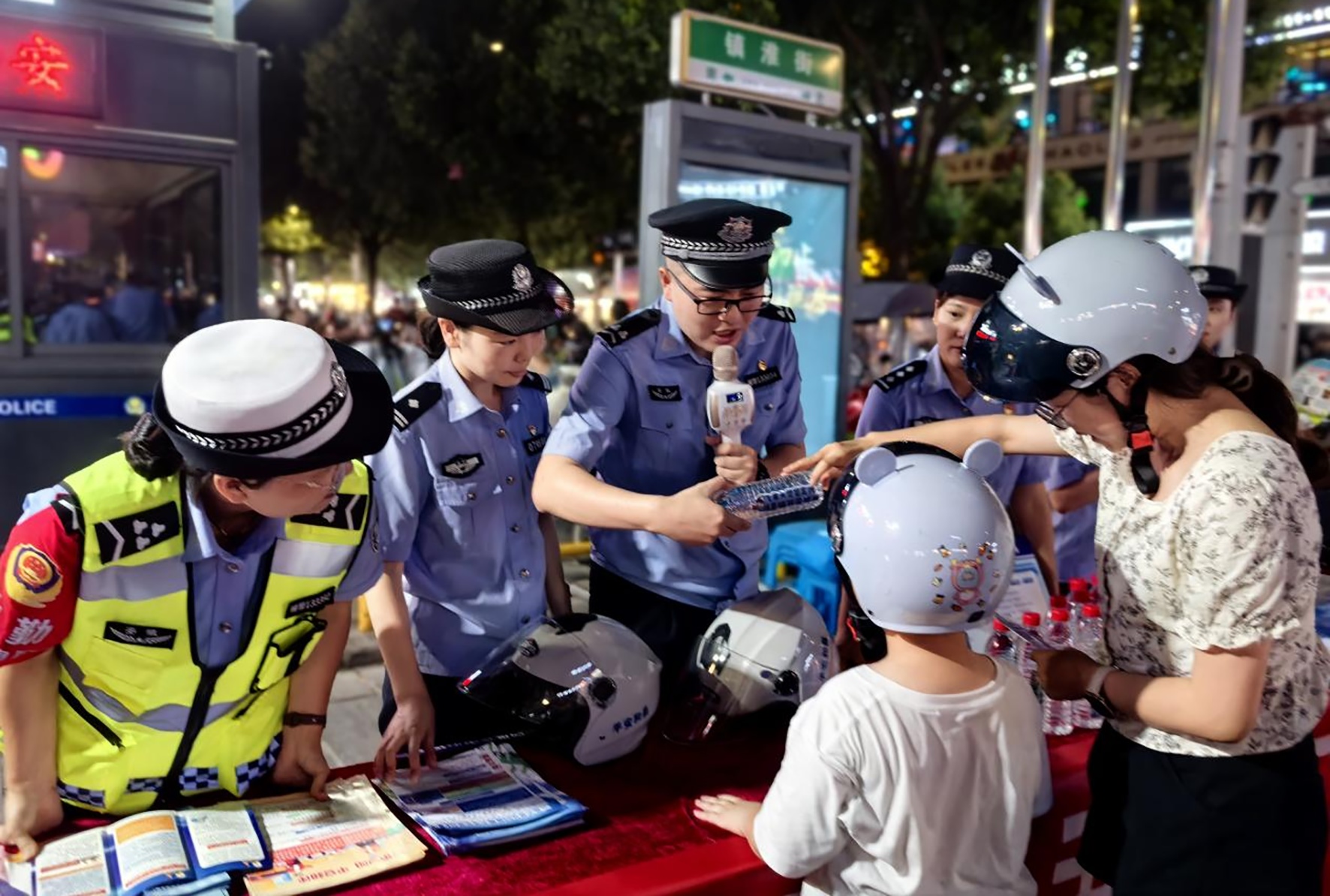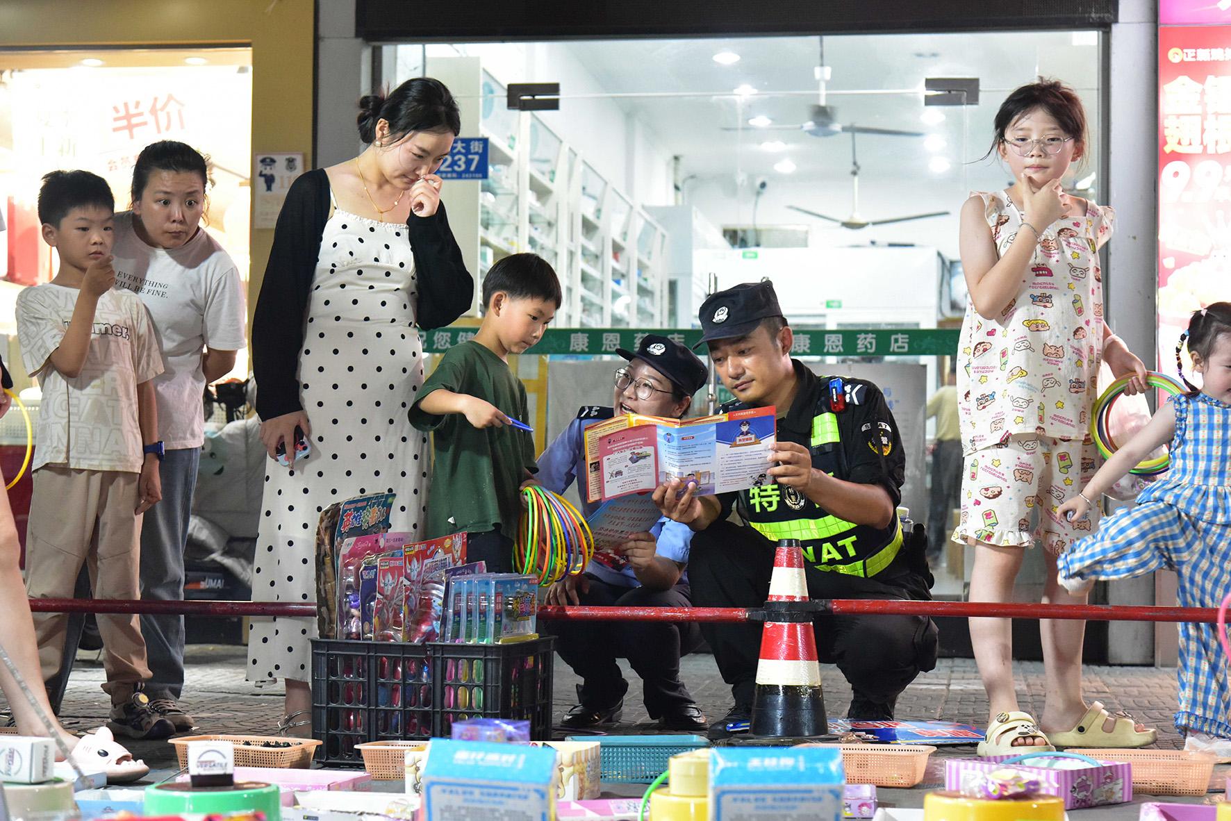 8月11日晚,安徽省和縣公安局經(jīng)偵、禁毒、刑偵等警種聯(lián)合在商業(yè)集中區(qū)域“擺夜攤”,與市民“零”距離互動,通過有獎競答,贈送法治用品等形式,提升群眾自我保護(hù)意識和法治意識。