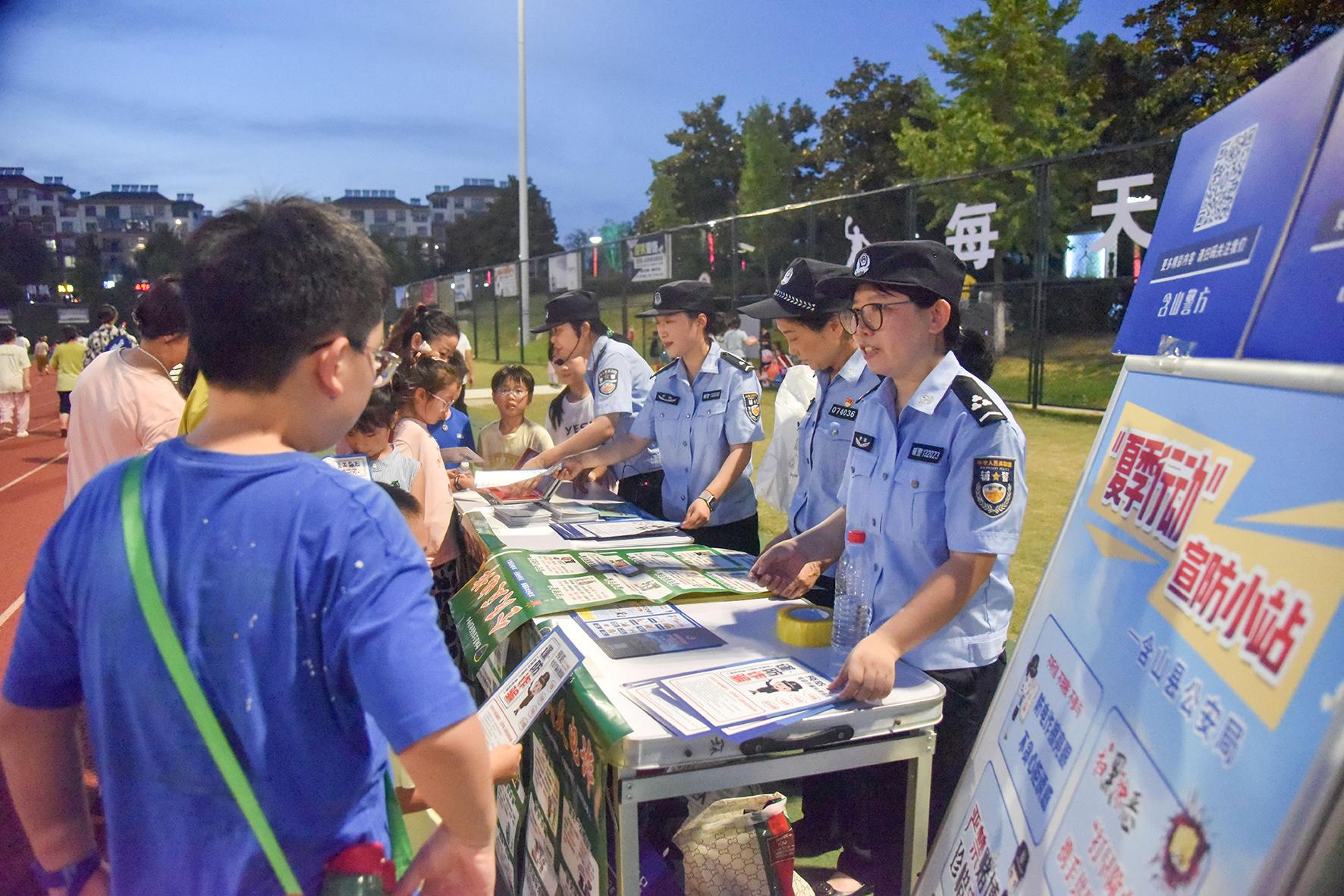 8月11日晚,安徽省當(dāng)涂縣公安局平安小分隊(duì)結(jié)合夏夜治安巡查宣防統(tǒng)一行動,深入社區(qū)、公園、夜市、廣場和群眾納涼場所等,以群眾“看得見、容易懂、記得住”的方式,開展防養(yǎng)老詐騙、防溺水、反傳銷、禁毒等安全知識宣傳。