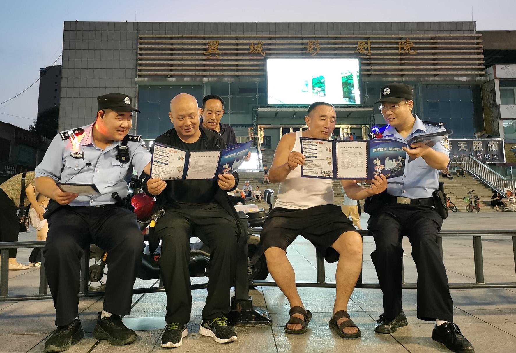 8月10日,山西省運(yùn)城市新絳縣公安局龍興派出所民輔警在全國夏夜治安巡查宣防第二次集中統(tǒng)一行動中走進(jìn)絳州廣場為休閑納涼的群眾宣傳防詐防火等安全知識。