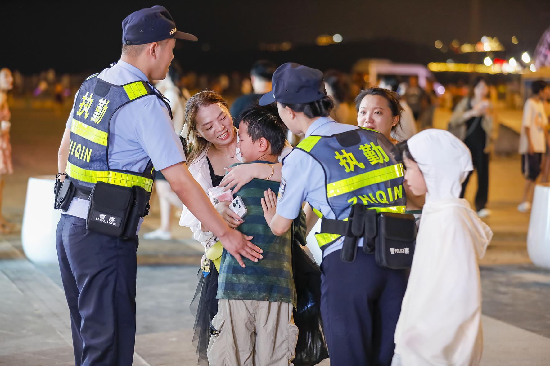 8月11日晚,福建省平潭綜合實(shí)驗(yàn)區(qū)公安局民警在龍王頭海洋公園幫助一名走失的兒童找到家長。
