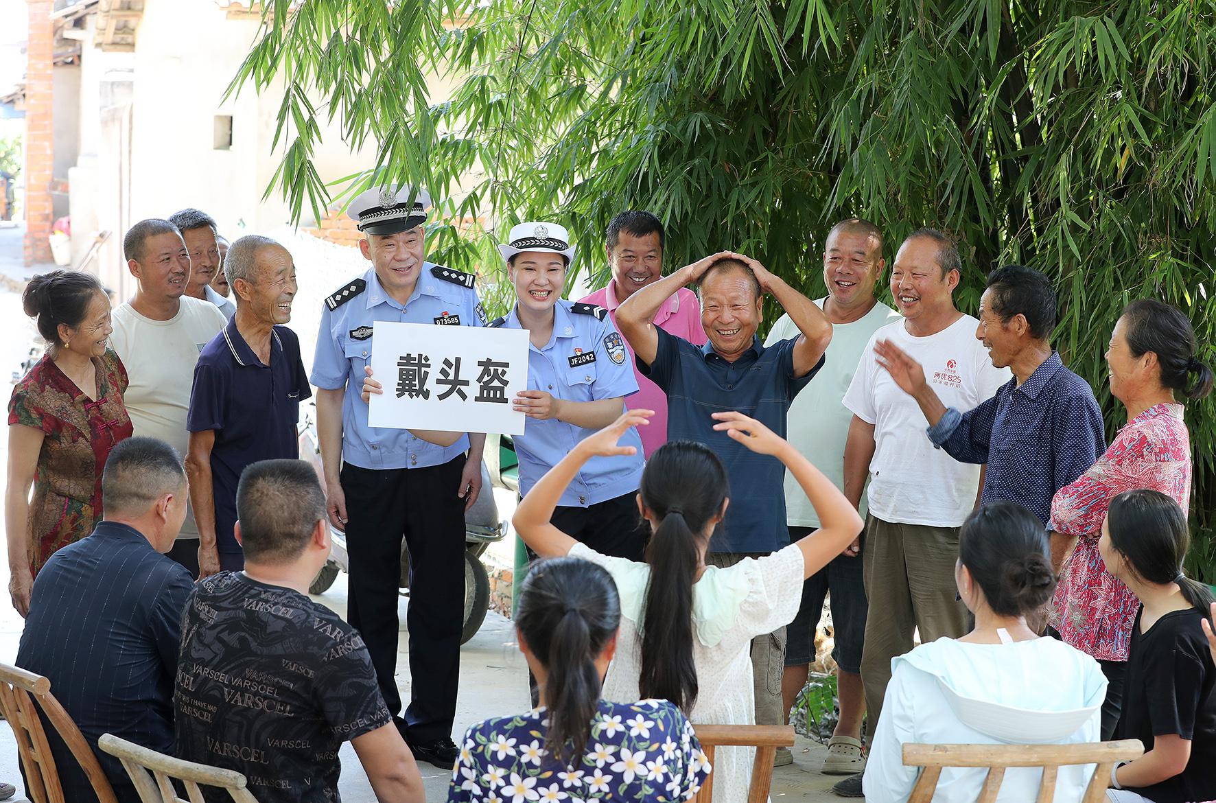 8月13日,在湖北省荊門市沙洋縣李市鎮(zhèn)新城村,沙洋縣公安局交警大隊(duì)民警通過(guò)“我比你猜”趣味活動(dòng),向村民宣傳交通安全知識(shí)。