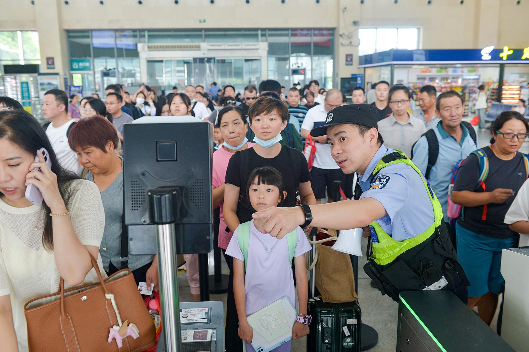 圖為8月14日,民警在檢票口維護(hù)秩序。