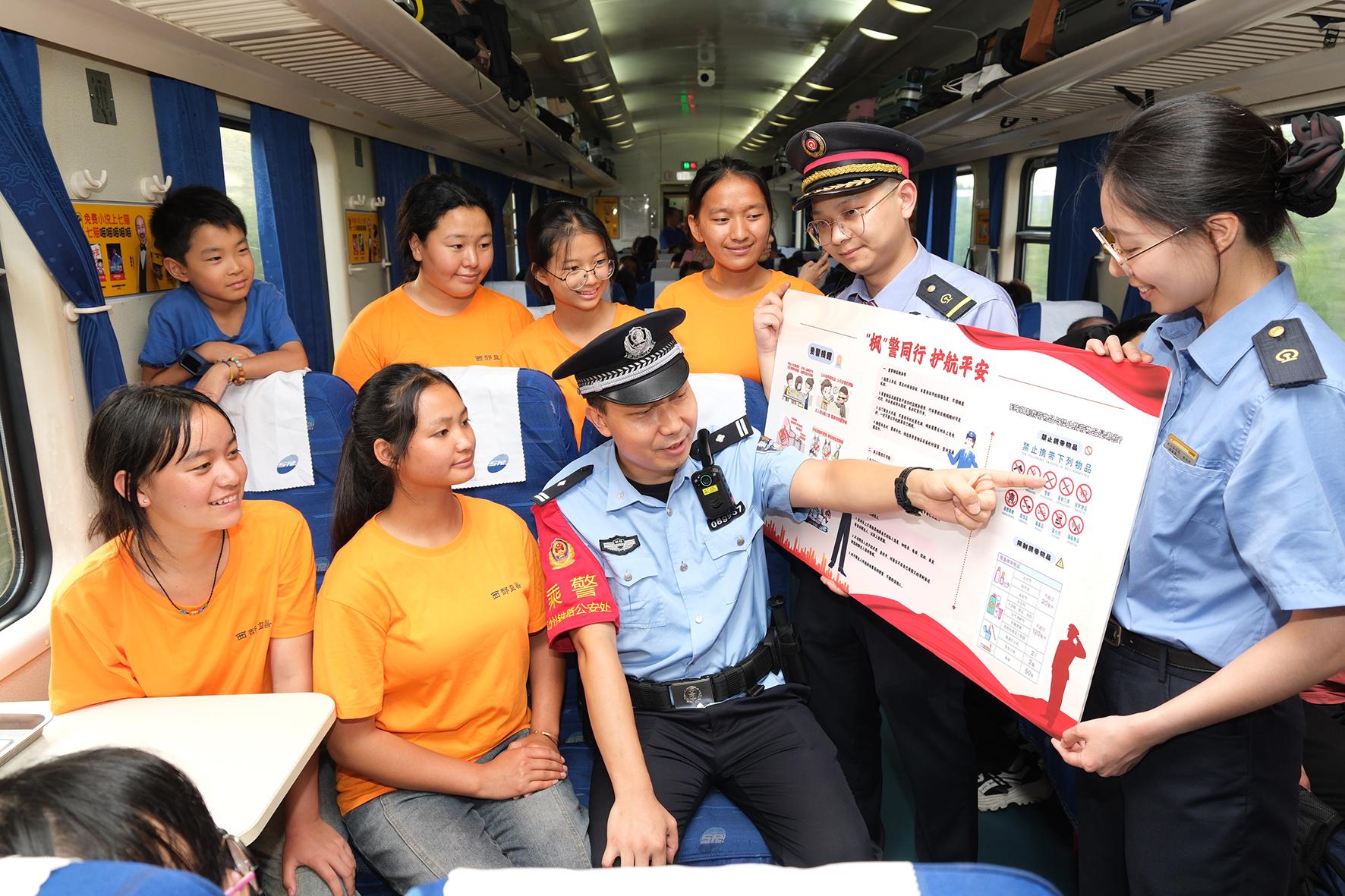 8月17日,杭州鐵路公安處乘警支隊(duì)乘務(wù)一大隊(duì)聯(lián)合杭州客運(yùn)段甬西車隊(duì)在寧波開往西安的K466次列車上,開展“‘楓’警同行 護(hù)航平安”的乘車安全宣講活動(dòng)。