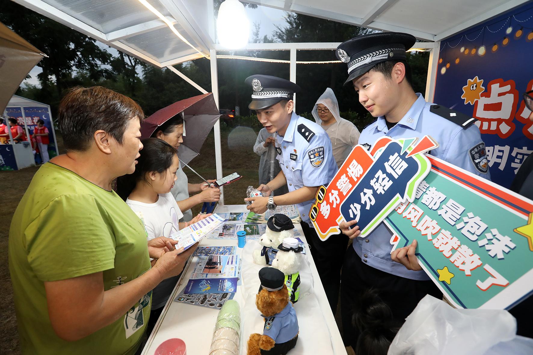 8月19日,江蘇省宜興市公安局太華派出所民警在“點(diǎn)亮星夜”文明實(shí)踐惠民夜集活動現(xiàn)場向群眾講解反詐和禁毒知識,提高群眾防騙和禁毒意識。