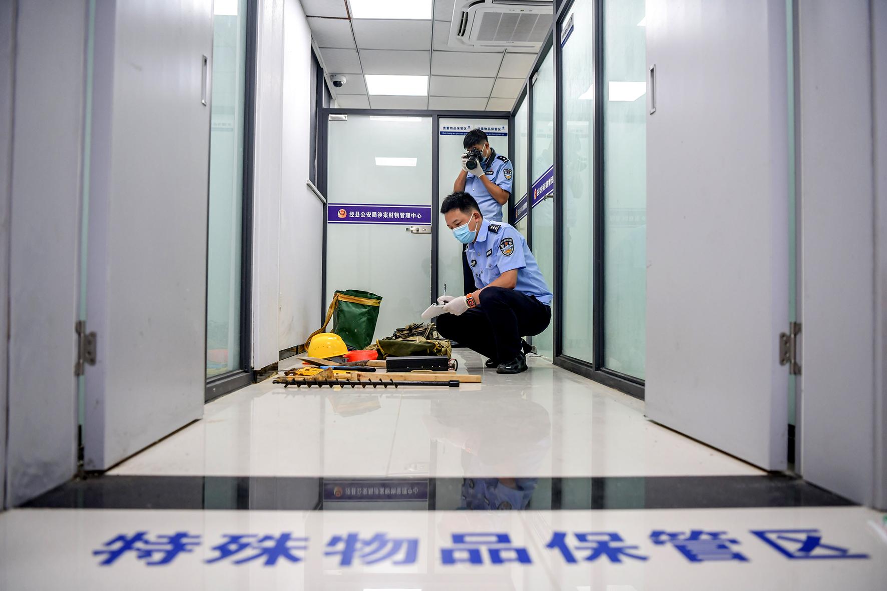 圖為辦案民警對(duì)涉案物品進(jìn)行登記入庫保存。