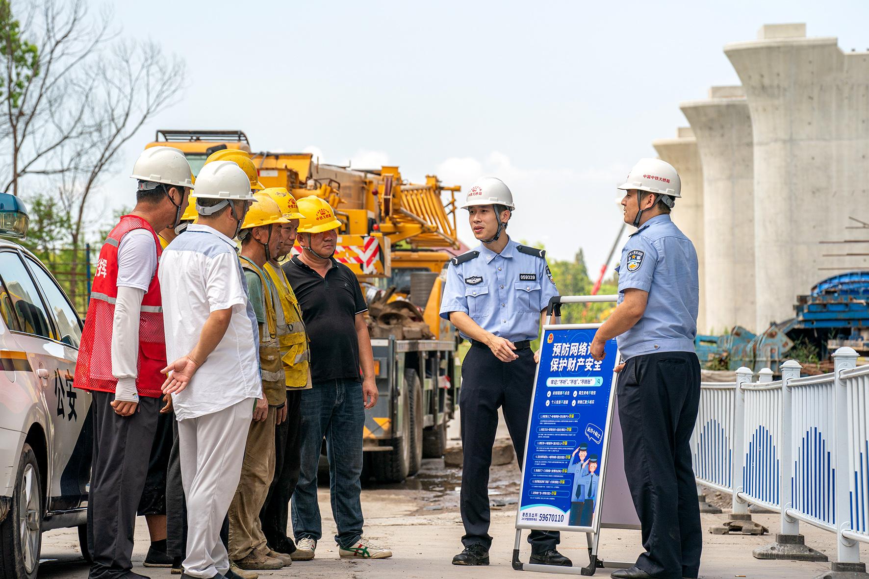 圖為8月21日,港西派出所民警來到轄區(qū)“滬渝蓉高鐵”在建工地開展電信網絡詐騙防范宣傳。