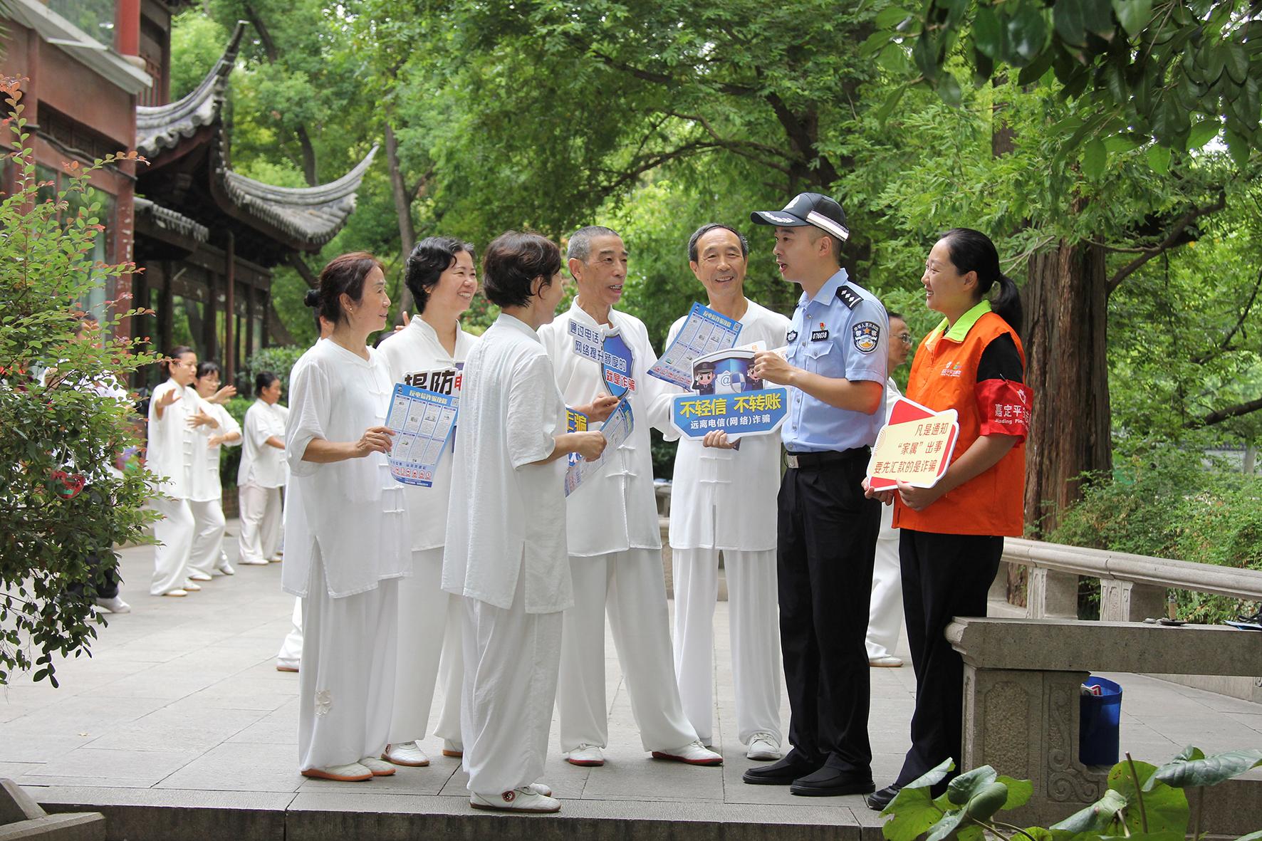 8月27日清晨,上海市公安局嘉定分局嘉城派出所民警與平安志愿者在轄區(qū)匯龍?zhí)豆珗@,向參加太極拳友會的中老年晨練者講解反詐知識。