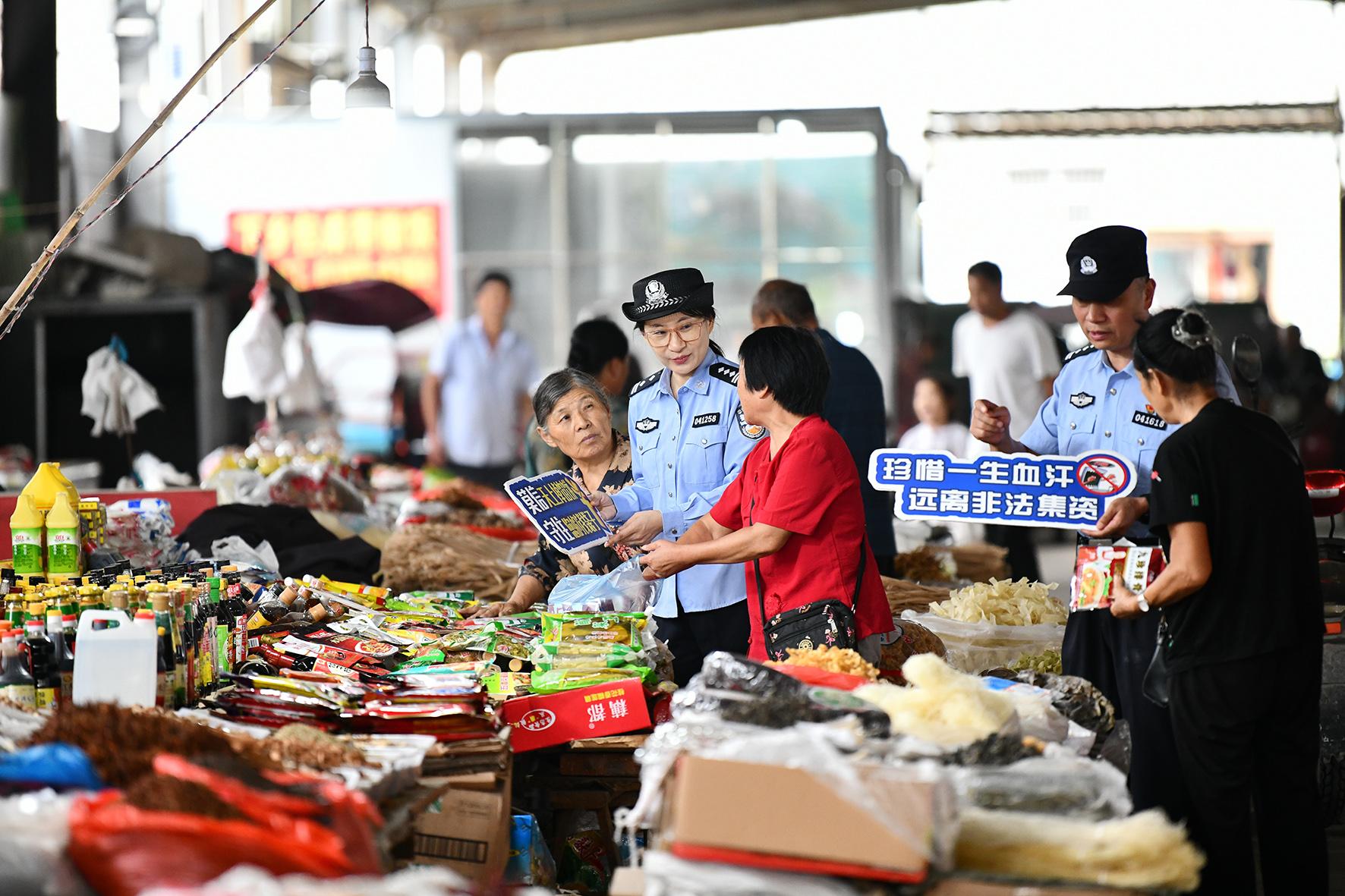 8月27日,安徽省阜南縣公安局民警在農(nóng)貿(mào)市場向群眾宣講養(yǎng)老詐騙、非法集資、經(jīng)營式傳銷等經(jīng)濟犯罪的手段和危害性。