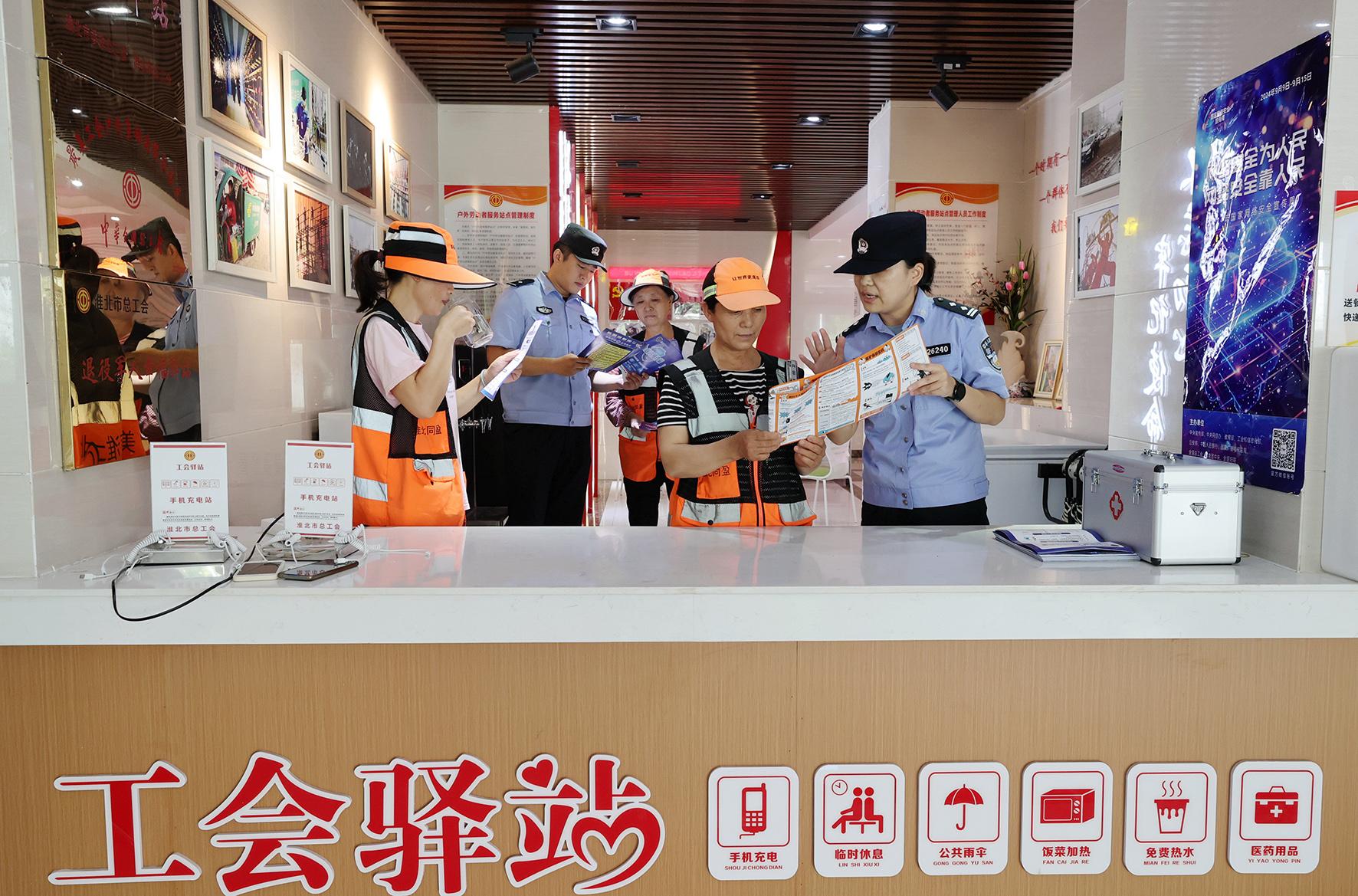 9月4日,安徽省淮北市公安局相山分局三堤口派出所民警在工會(huì)驛站里,向休息的戶(hù)外勞動(dòng)者宣傳網(wǎng)絡(luò)安全知識(shí)。