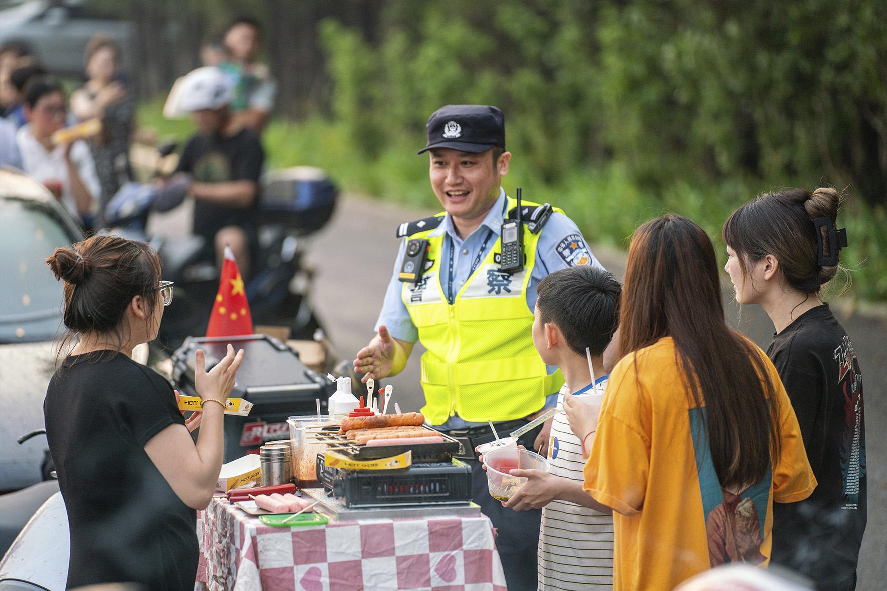 圖為民警在環(huán)島江堤對商戶開展安全提示。