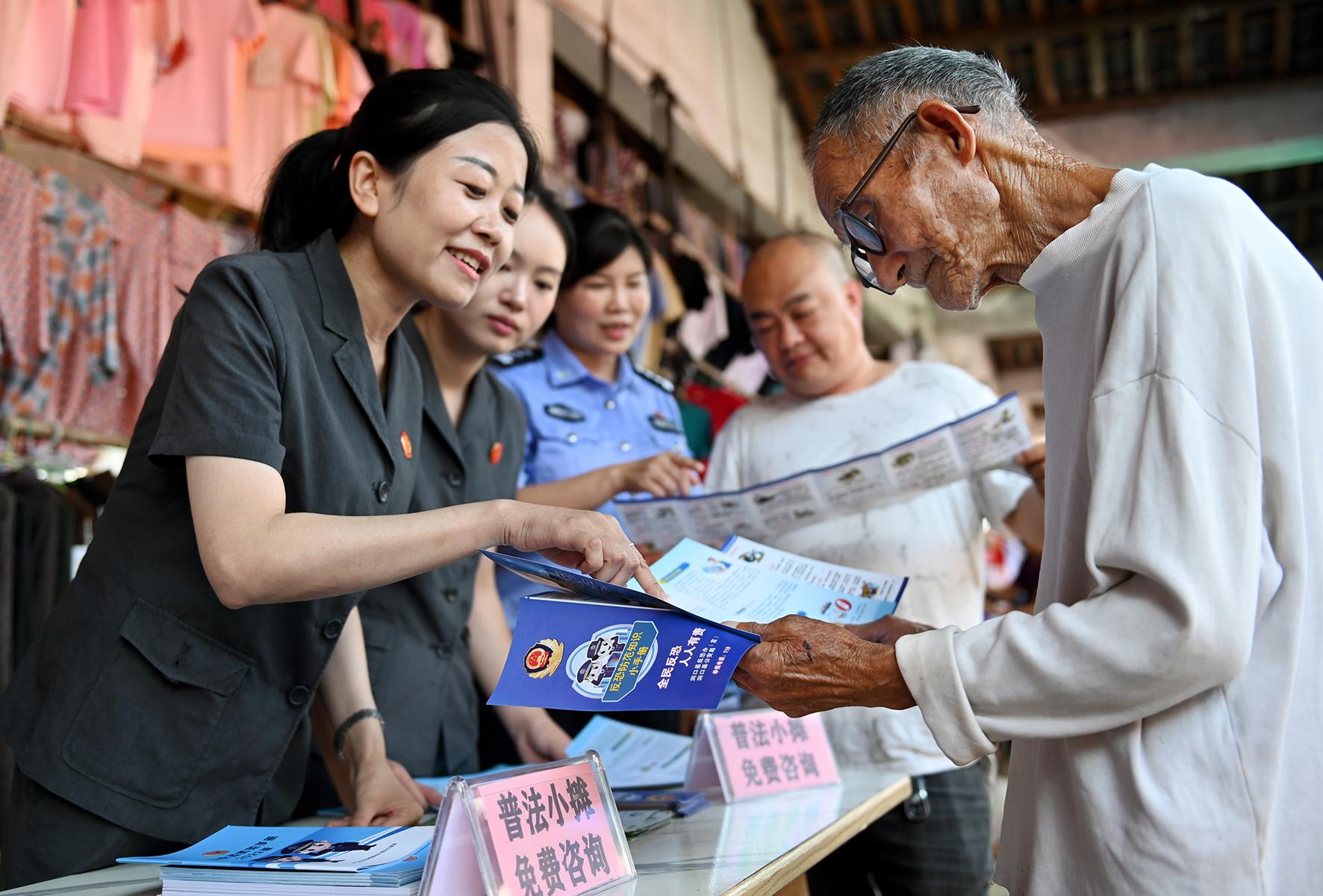 9月19日,湖南省洞口縣人民法院干警在楊林鎮(zhèn)農(nóng)貿(mào)市場(chǎng)向群眾宣講法律知識(shí)。連日來,洞口縣人民法院干警利用當(dāng)?shù)剜l(xiāng)村趕集日,向群眾宣講防范非法集資、反詐、民法典等法律知識(shí)。